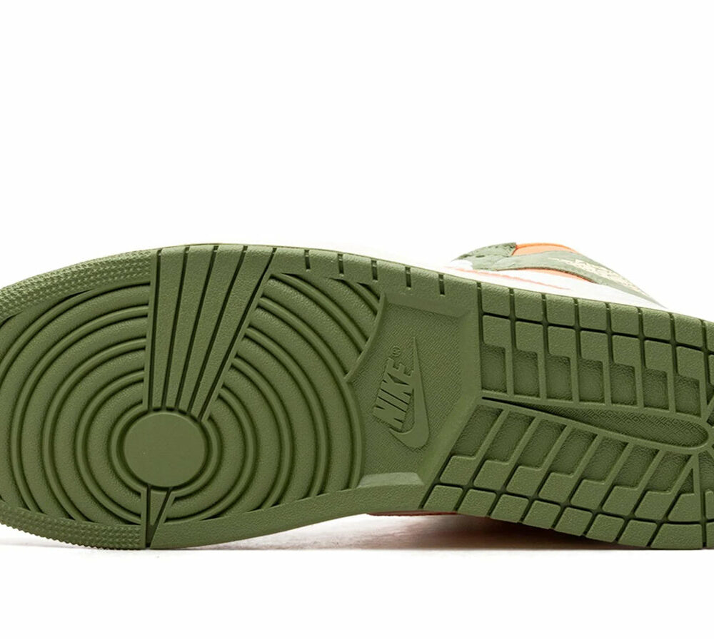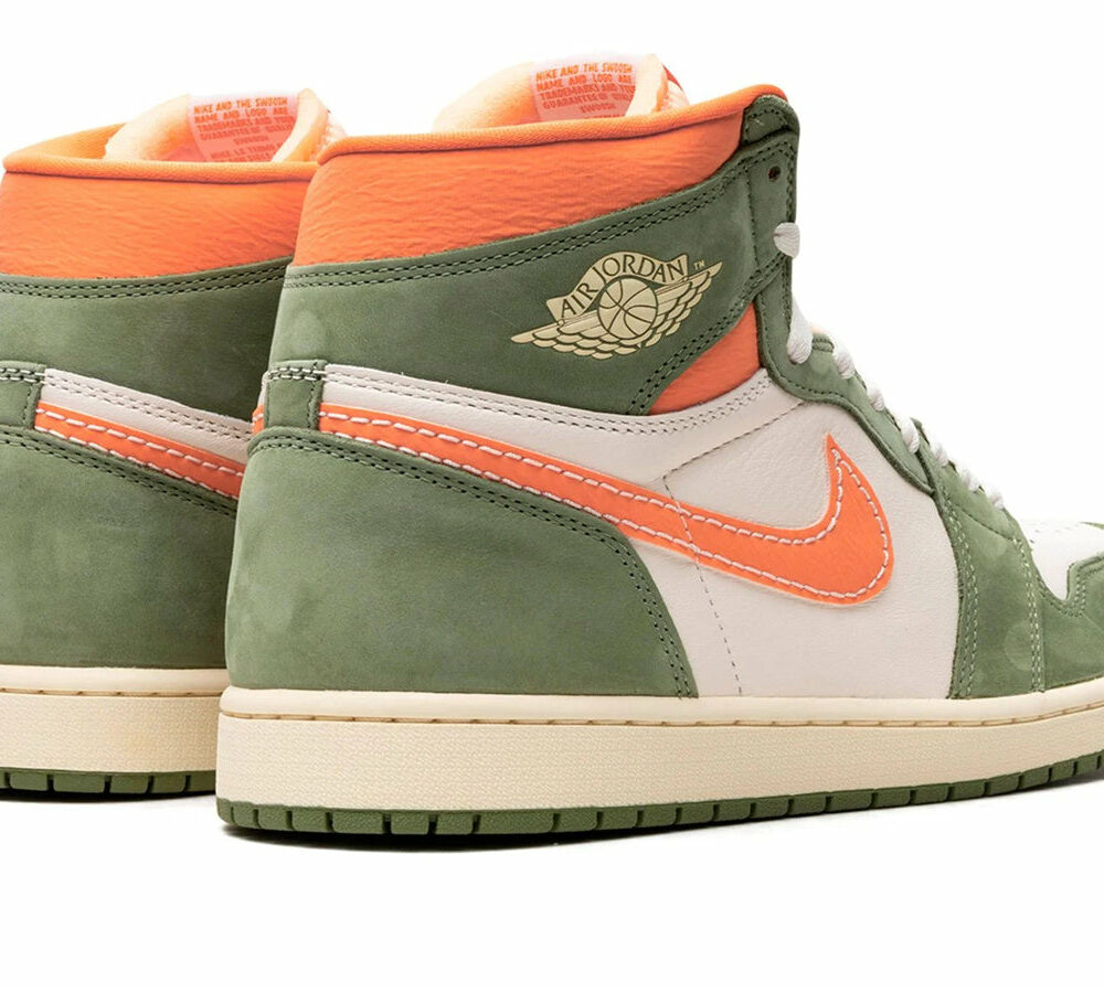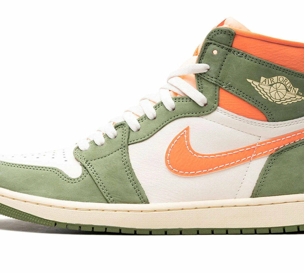 The Air Jordan 1 High OG Craft Celadon blends luxury and heritage. Its white leather upper is accented by olive green suede overlays and vibrant Bright Mandarin Swooshes, creating a striking contrast. The aged midsole and green rubber outsole complete the design, offering both comfort and style.