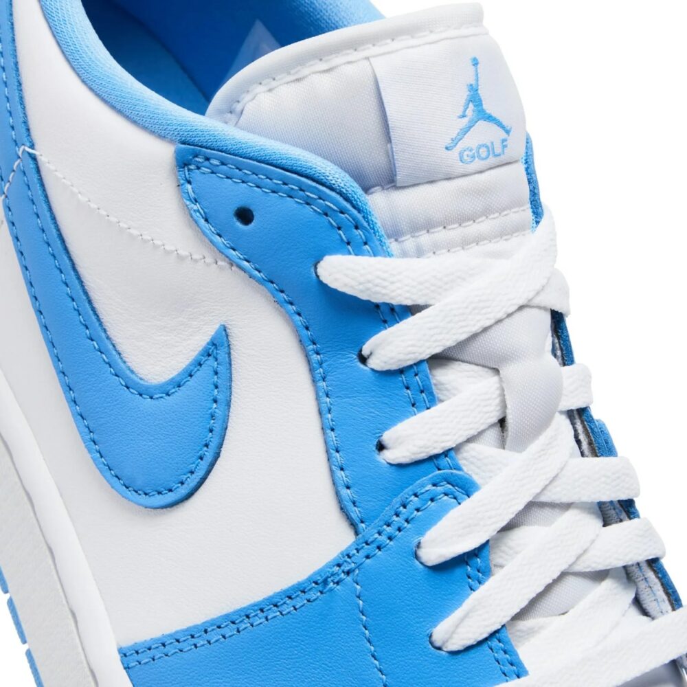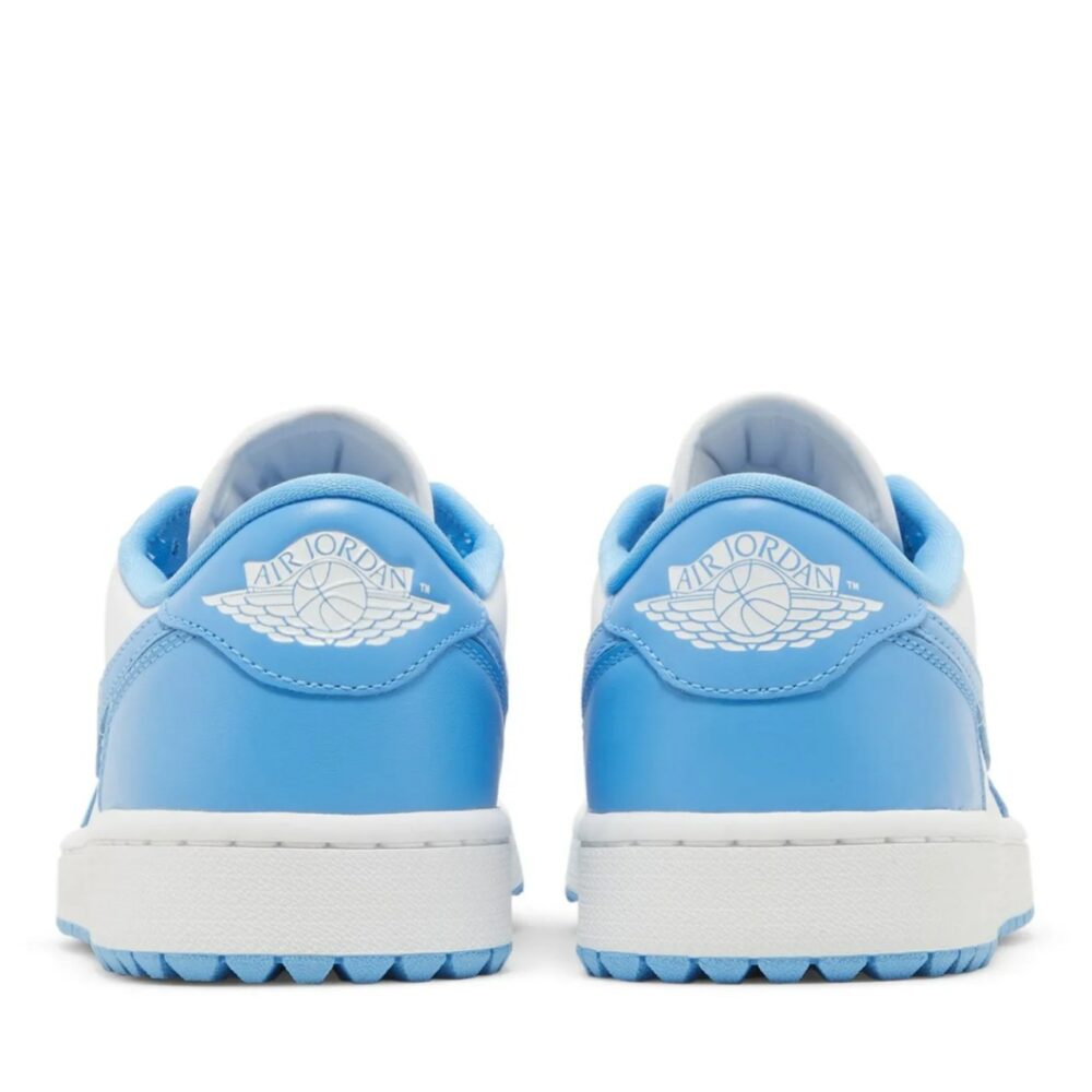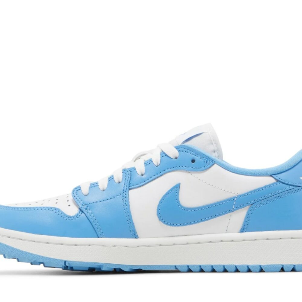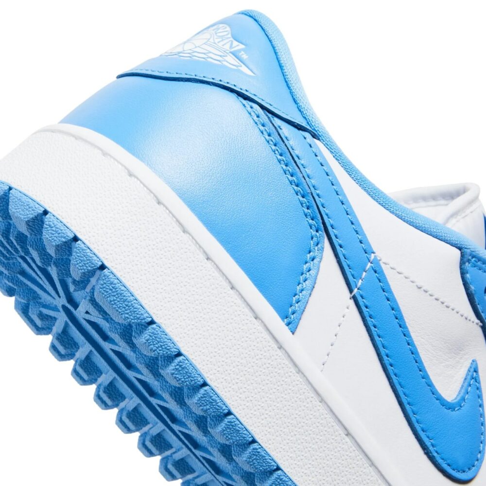 The Air Jordan 1 Low Golf ‘UNC’ transforms the iconic silhouette into a performance shoe built for the golf course. The all-leather upper pairs a crisp white base with contrasting overlays in University Blue. Jumpman branding appears on the woven tongue tag, while a retro Wings logo is stamped on the heel tab. Like the original Air Jordan 1, the midsole packs an encapsulated Air-sole unit in the heel for lightweight cushioning. The outsole features an integrated traction pattern that delivers exceptional grip during rotational movements.