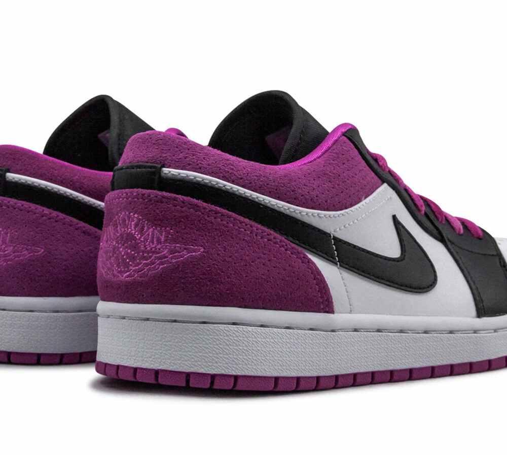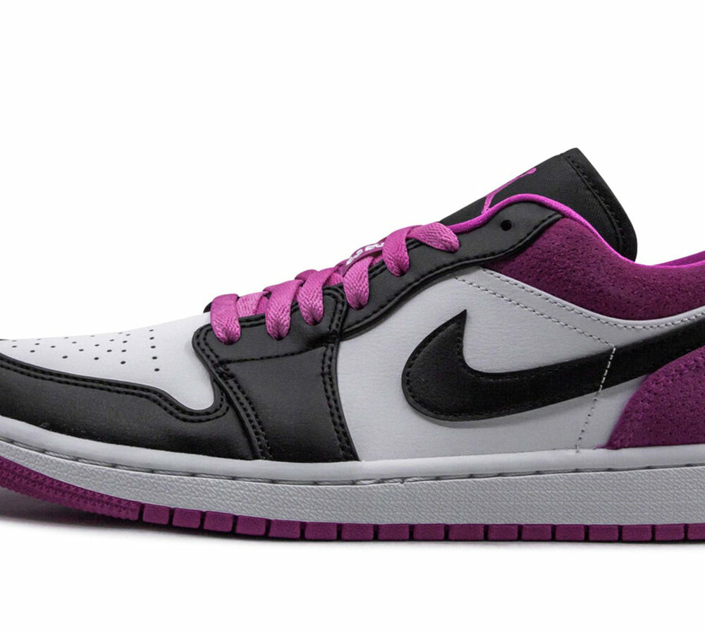 The Black Active Fuchsia Jordan 1 Low adopts a classic silhouette with an upper constructed of leather and synthetic materials, providing durability and comfort. The shoe's midsole is cushioned to provide responsiveness and comfort. The rubber outsole provides traction and durability. The shoe displays the iconic Nike Swoosh on both sides, the Air Jordan Wings logo on the heel, and Jumpman branding on the tongue. The shoe also features a perforated toe box for breathability.