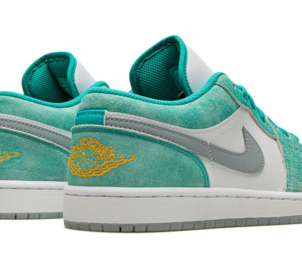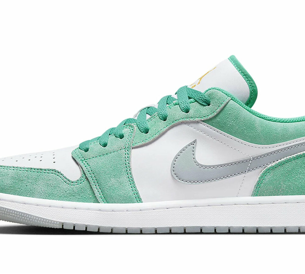 The sides, toes, and ankles of the Air Jordan 1 Low New Emerald GS pair are covered in white leather. This sneaker also features a rugged suede overlay system that is covered in a light grey hue.