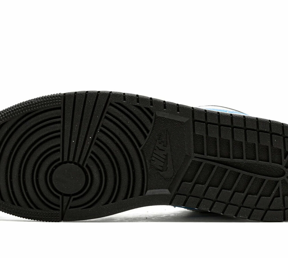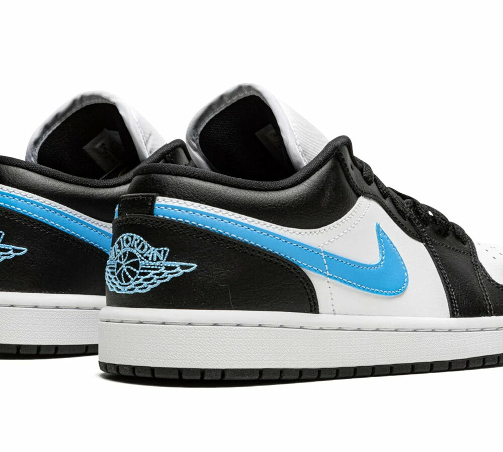 The Air Jordan 1 Low "Black University Blue" is a low-top women's sneaker that features an all-leather upper. The white base is contrasted by black overlays, a signature Swoosh, stitched Wings logo on the heel, and a Jumpman icon embroidered on the nylon tongue in University Blue. It is built on a sturdy rubber cupsole with encapsulated Air cushioning in the heel.