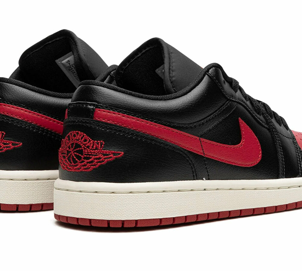 The shoe features a Black and Gym Red calf leather construction, but Black is the dominant hue. Gym Red leather accents include the Swoosh across the side panels and the perforated vamp. In addition, the Air Jordan branding details on the heel and the Jumpman motif on the tongue come in Gym Red. Like other Jordan 1 Low models, this iteration boasts a low-top design, a round toe, and a laced-up fastening on the front.