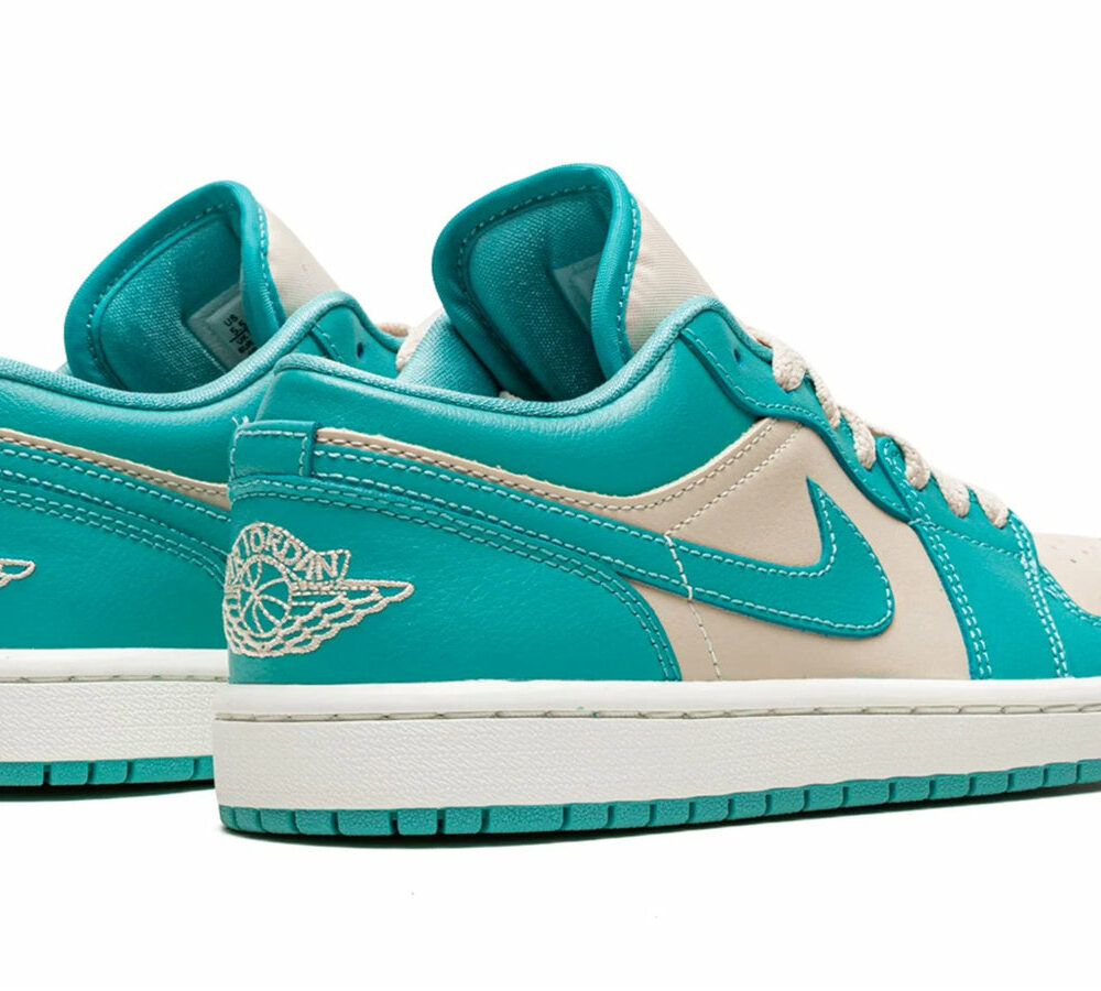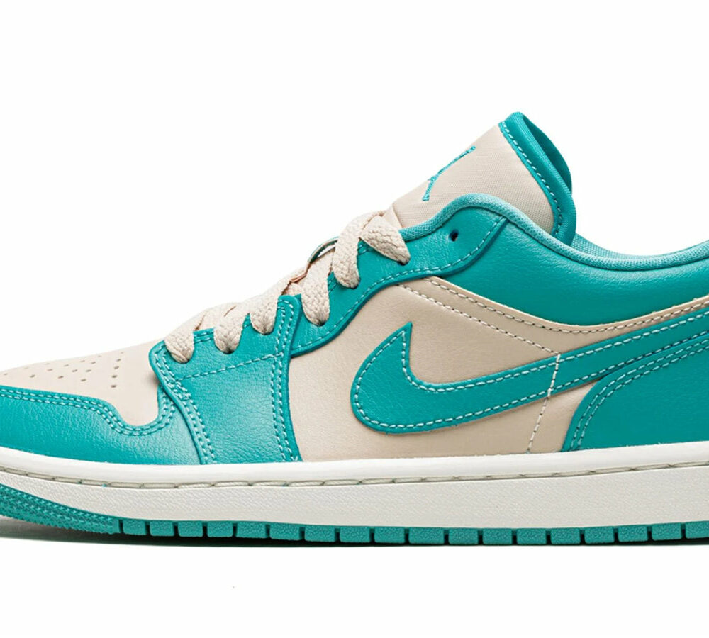 The Air Jordan 1 Low 'Tropical Teal Sandy Beige' is a stylish sneaker designed for women. It features a neutral beige hue paired with a tropical teal green, creating a perfect balance between style and comfort. This sneaker is perfect for any activity, from running errands to hitting the gym. The inspiration behind the design is the Dark Marina colorway, which is sure to make a statement. The rubber sole provides superior traction and durability, making this sneaker perfect for any occasion. With its unique colorway and timeless silhouette, the Air Jordan 1 Low 'Tropical Teal Sandy Beige' is sure to be a hit.