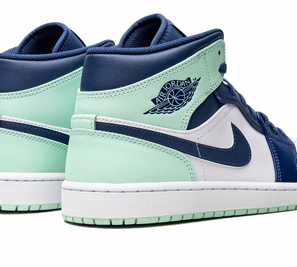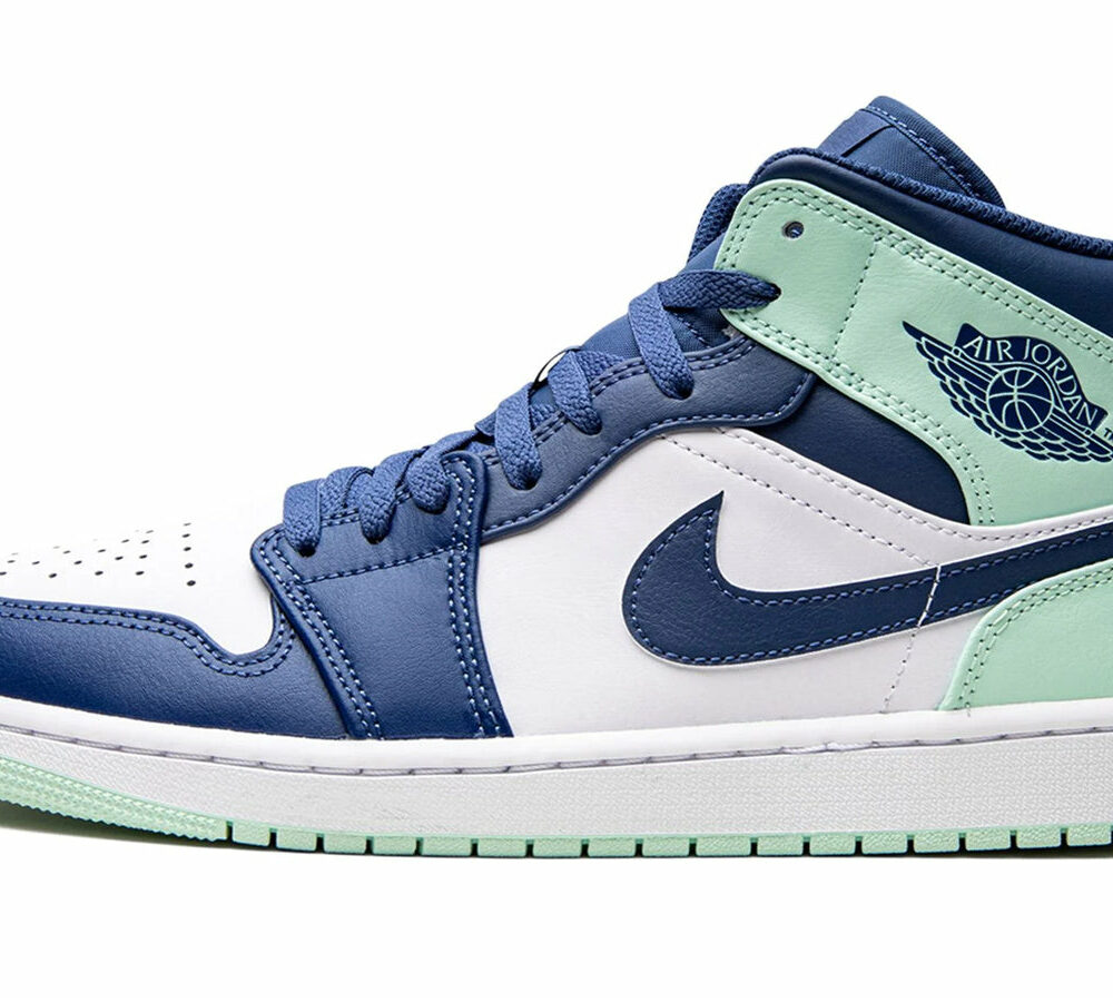 The Air Jordan 1 Mid Blue Mint (GS) features a blue and white color combination. The blue is accented with Metallic Silver from the TPU midsole and heel counter, while the Nike Air logo is executed in Electrolime at the tongue. The midsole is fitted with deep flex grooves and has a blend of a white rubber outsole.