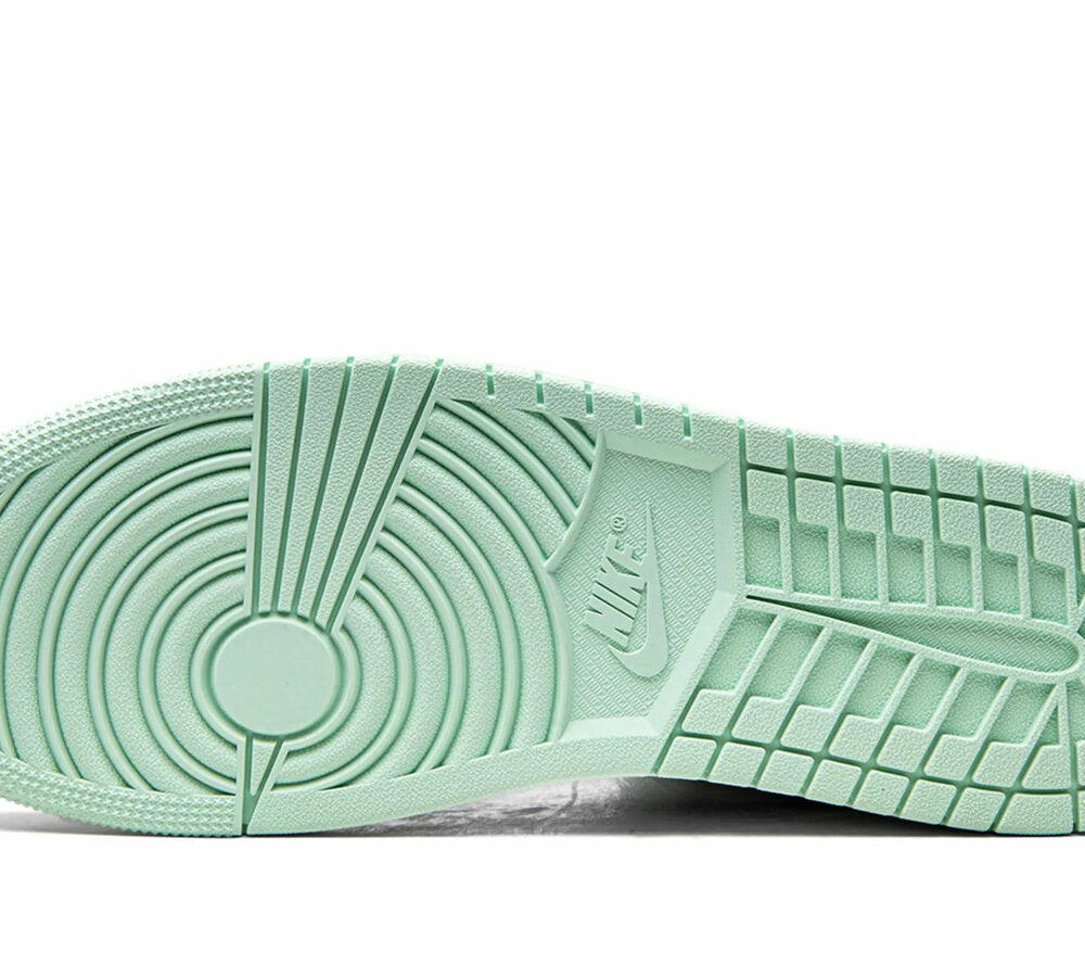 The Air Jordan 1 Mid Blue Mint (Gradeschool) features a leather upper, with stitched and overlays an Air-Sole unit, heel Air unit, and an outsole with a herringbone traction pattern.