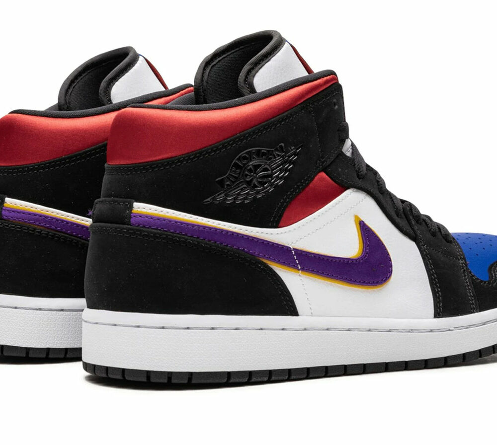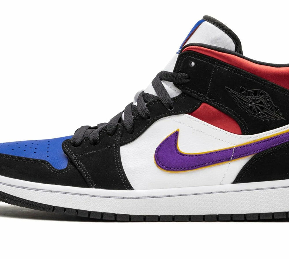 The shoe combines the classic Bred, Chicago, and Royal colorways - representing some of the most popular Air Jordan 1 releases. It features a white leather base with black overlays, a blue toe box, red collar and purple Swoosh with a gold outline. It also retains the signature elements of the Air Jordan 1, such as the iconic Swoosh logo on the sides and the Wings logo on the ankle collar.