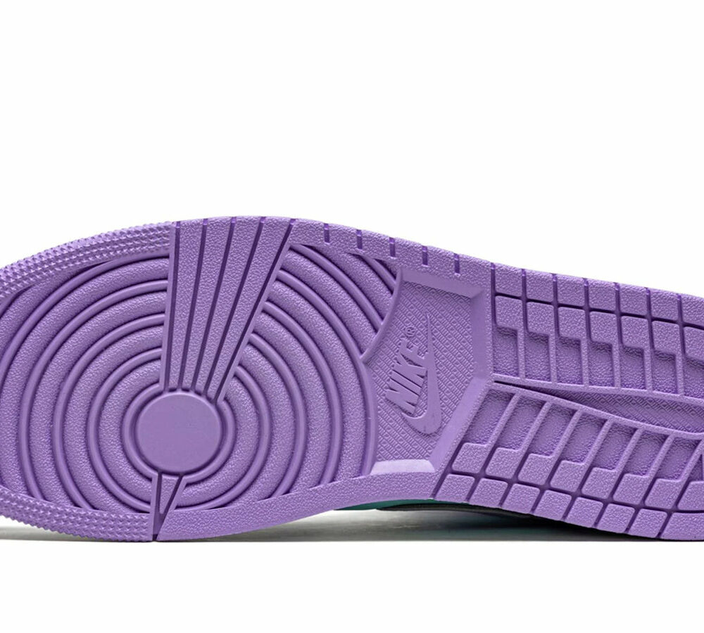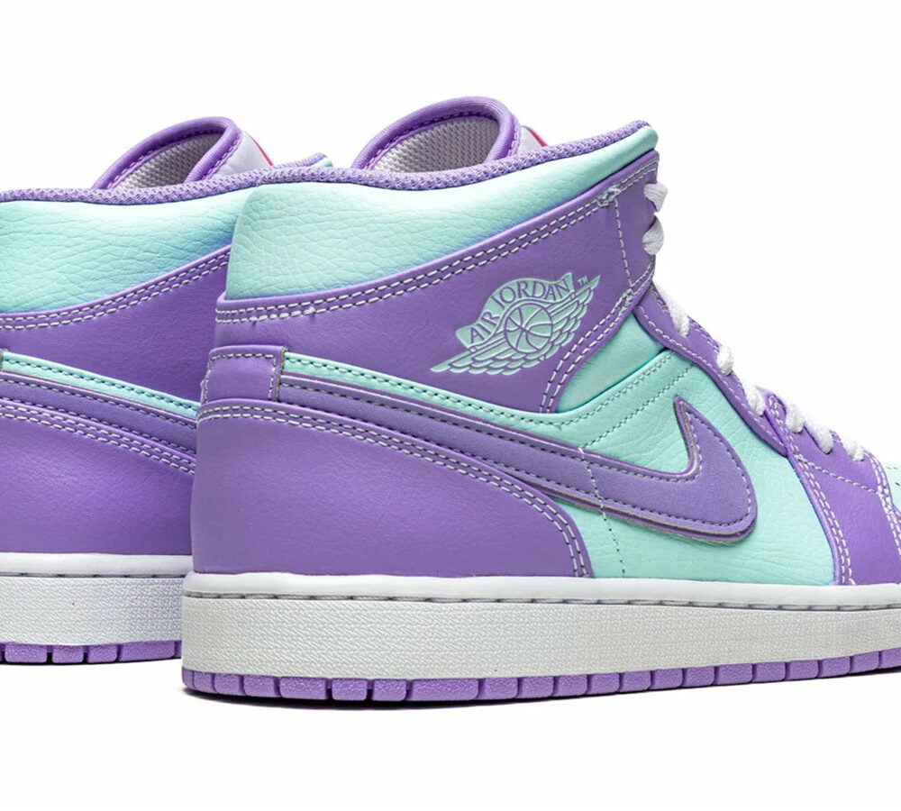 This iteration of the Jordan 1 Mid features a leather upper. The shoe's base appears in Aqua, while pastel Purple overlays appear on the toe box, under the white laces, and around the heel. The Nike swoosh also appears on the midsole in the same pastel purple color, and the shoe features a pastel Purple ankle strap. The Jordan logo adorns the ankle strap in pastel blue. A white and Purple rubber outsole for traction finishes off the design.