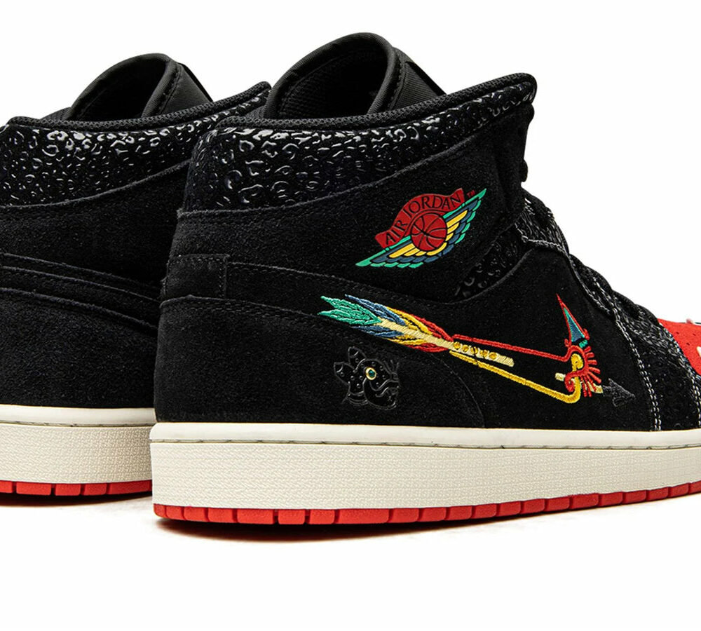 The Jordan 1 Mid Siempre Familia (GS) comes in a blend of black, Sail, and Chile Red colors. It was designed specifically for grade schoolers.