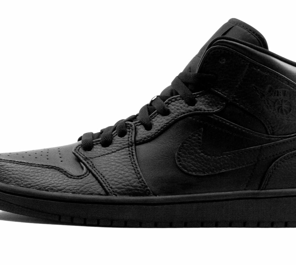 The Air Jordan 1 Mid Triple Black is a mid-cut design of the OG Air Jordan 1. Composed of a leather upper on top of a hardened rubber outsole, this shoe has a monochromatic look, as every part of the shoe, from the laces to the Swooshes, is black. Created with basketball players in mind, it boasts a cushioned midsole and ankle support.