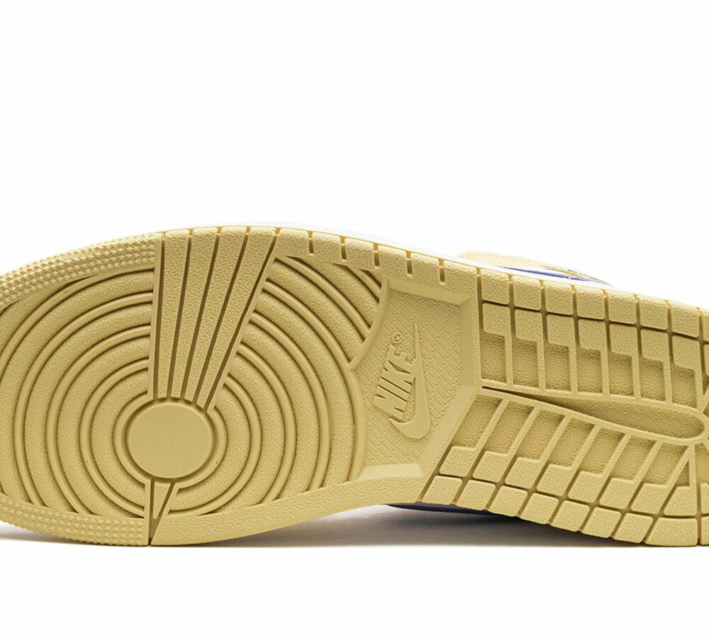 This version of the Air Jordan 1 featured a white leather upper with lemon wash overlays. The lemon wash color was also featured prominently on the rubber outsole. The look was finished off with lapis blue pops of color throughout the sneaker, including on the Jumpman logo on the tongue tag, the "Wings" logo and, of course, on the Swooshes.