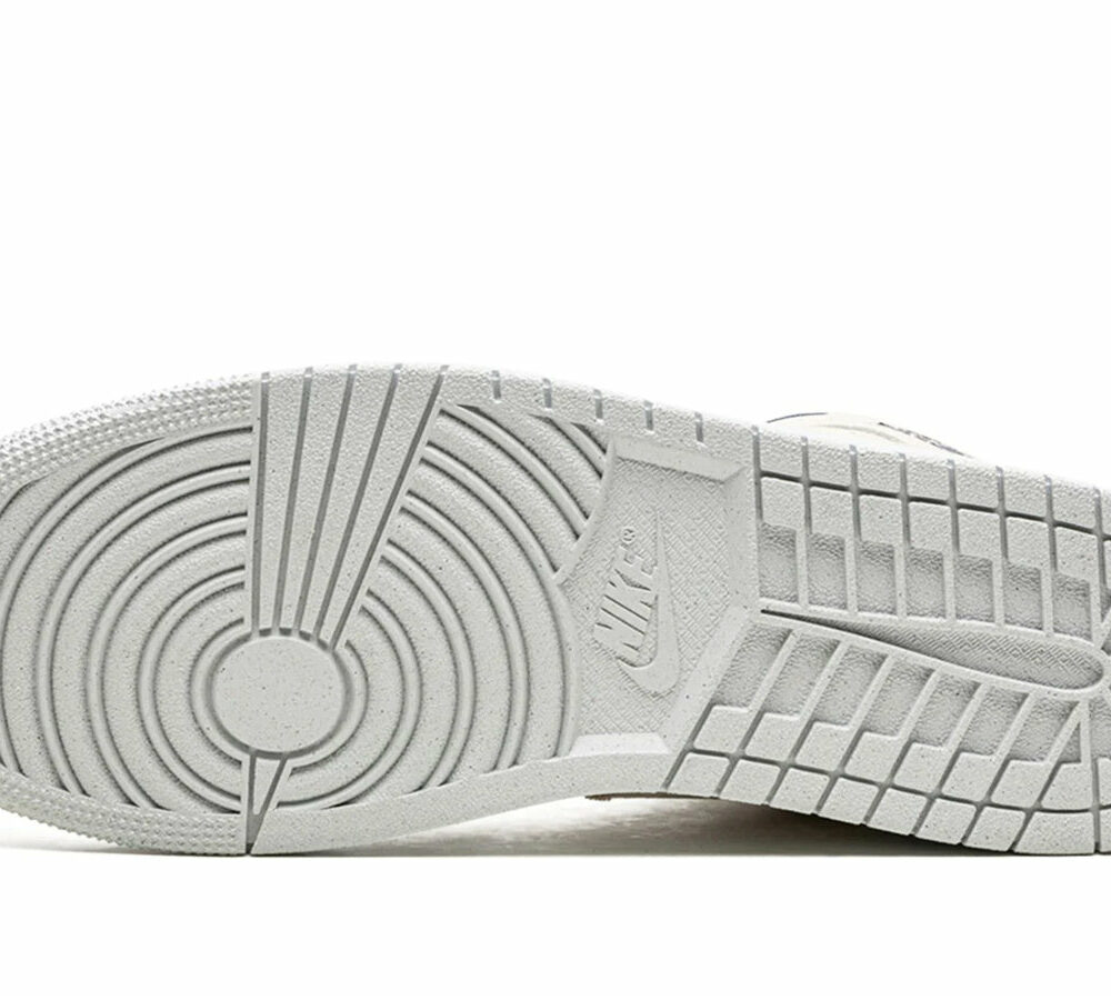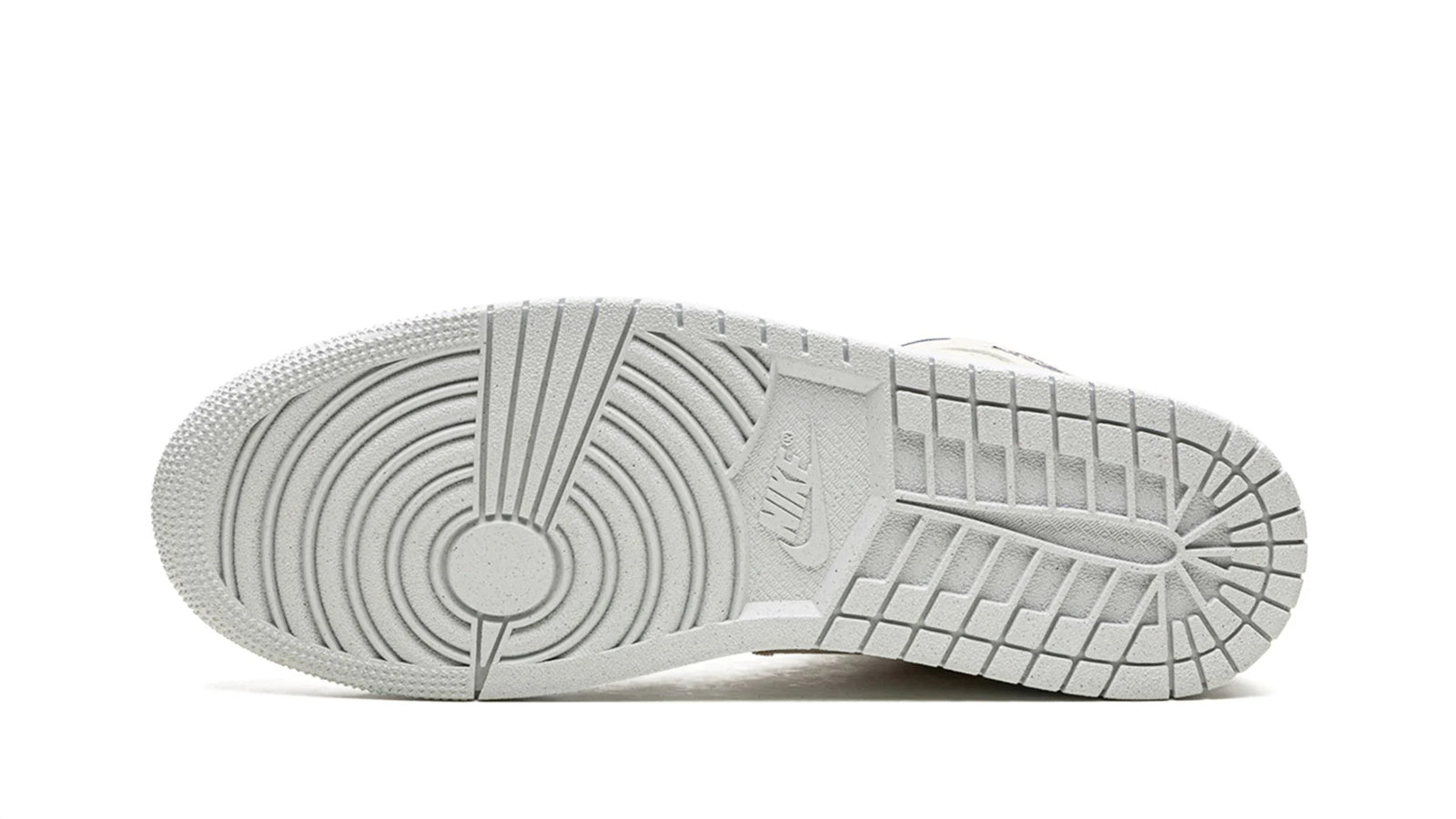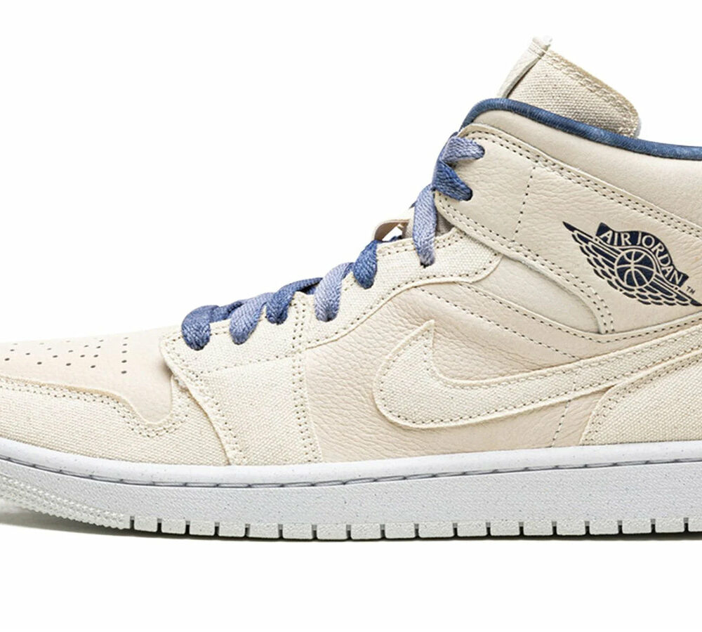 The Jordan 1 Mid SE Sanddrift features a tumbled leather upper in the color Sanddrift with tonal canvas overlays on the toe cap, eyestays, heel, tongue, and swoosh. The leather toe box sports perforations and the leather tongue tag has a debossed Jumpman. The darker contrasting navy color accents the sneaker in the laces and lining with a tie-dye-like pattern. Navy is also used for the Wings logo on the collar and the Jumpman on the Sanddrift insole. The midsole is white foam with Air and the outsole is white rubber.