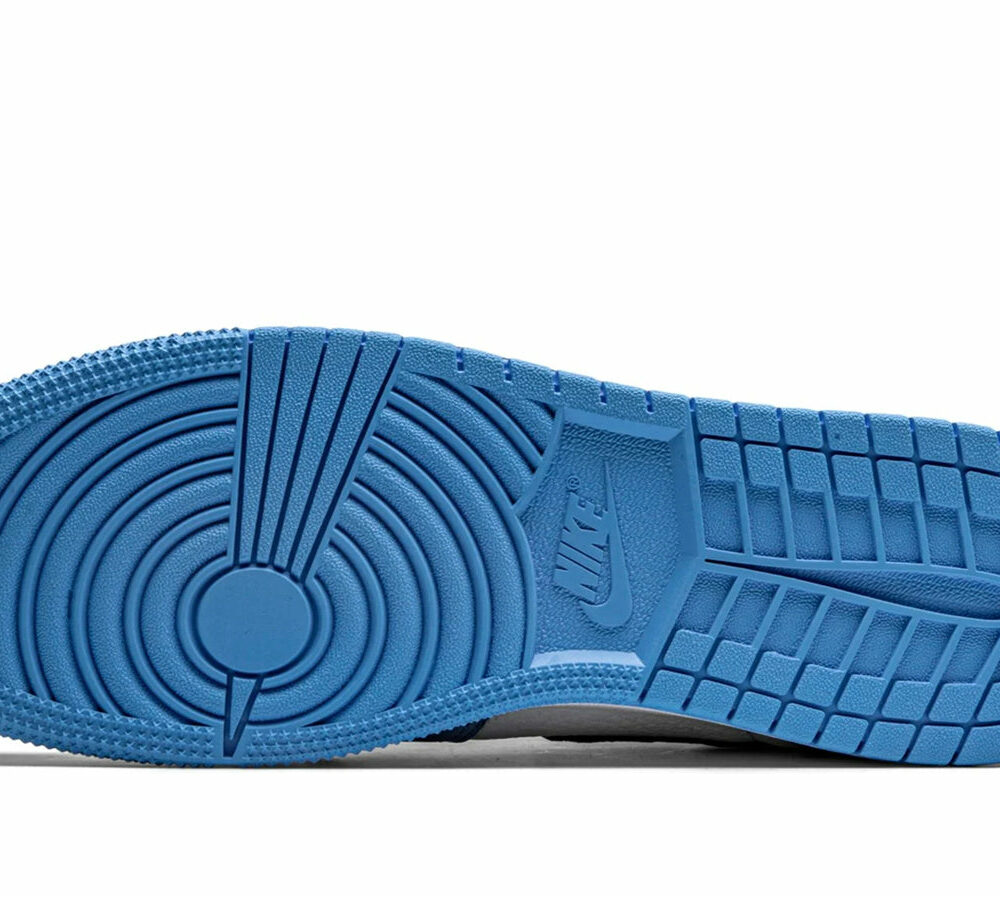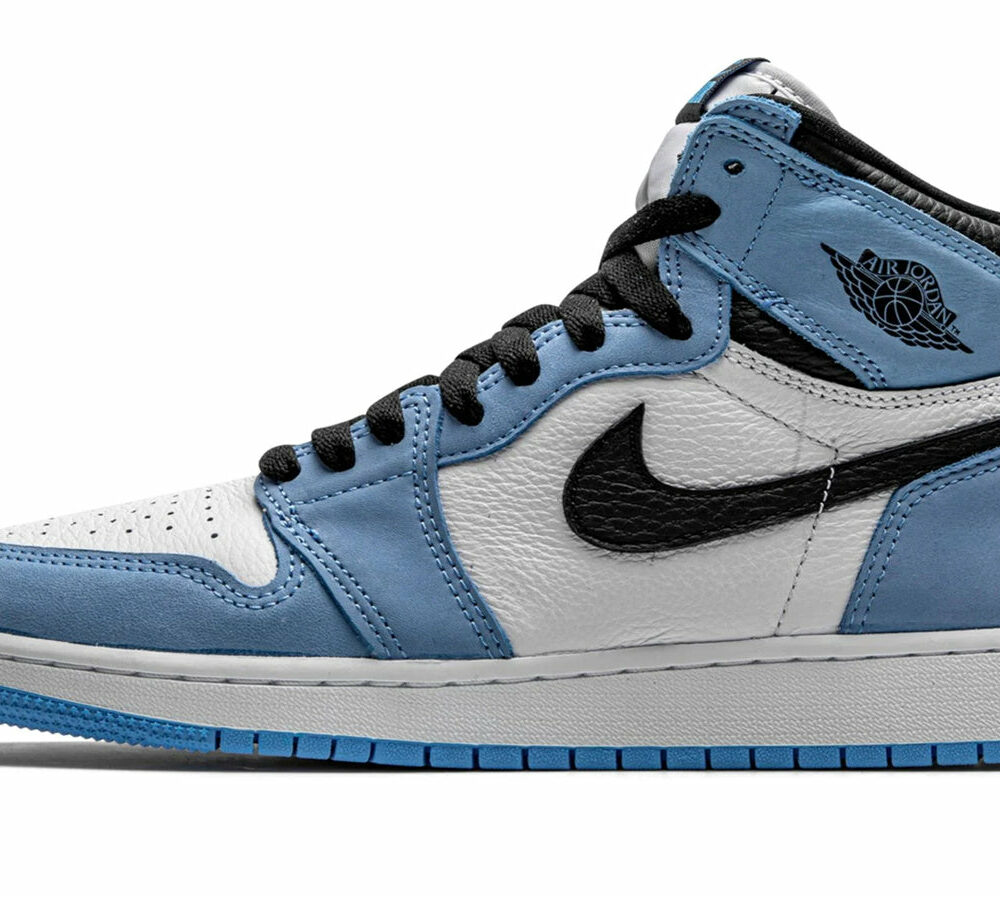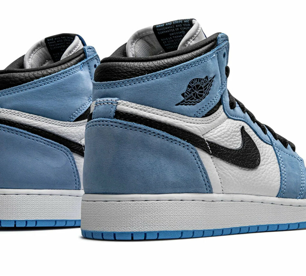 The Air Jordan 1 Retro High OG GS 'University Blue' is a sneaker made for grade schoolers that pays homage to Michael Jordan's UNC alma mater. The upper is white tumbled leather with pale blue leather overlays at the toe, heel and collar. The lateral side features a black Jordan Wings logo. A black Swoosh cuts across the quarter panels. Classic Nike Air branding adorns the tongue tag and sockliner. These sneakers are sure to be a hit with young Jordan fans.