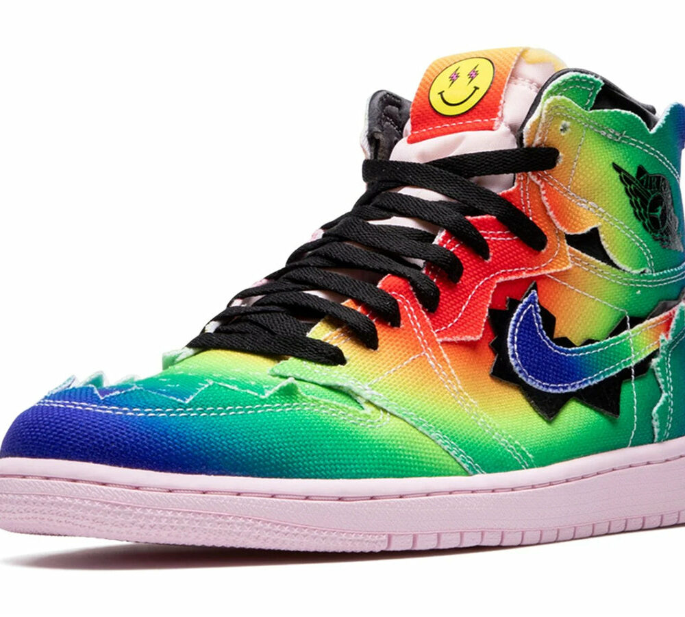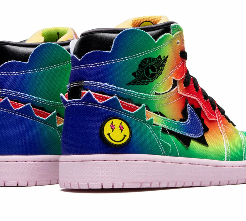 J Balvin x Nike Air Jordan 1 - Colores Y Vibras Nike has teamed with the Colombian artist - Balvin, finally launching their eye-catching Air Jordan 1 “Colores Y Vibras” This pair of shoe upper is composed by a canvas, and immersed in a palette of rainbow colors. The exposed foam tongue has a set of three Velcro icons on the heel, and Balvin's Happy Face logo covers the tongue label of the left shoe.