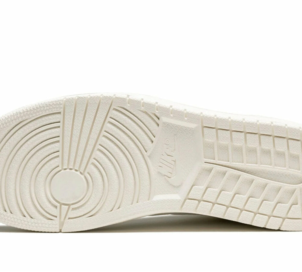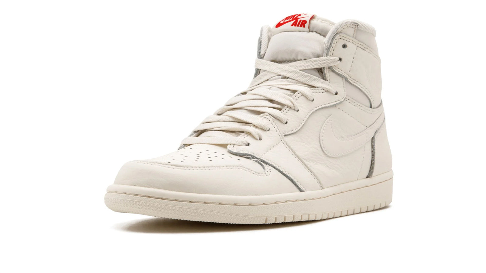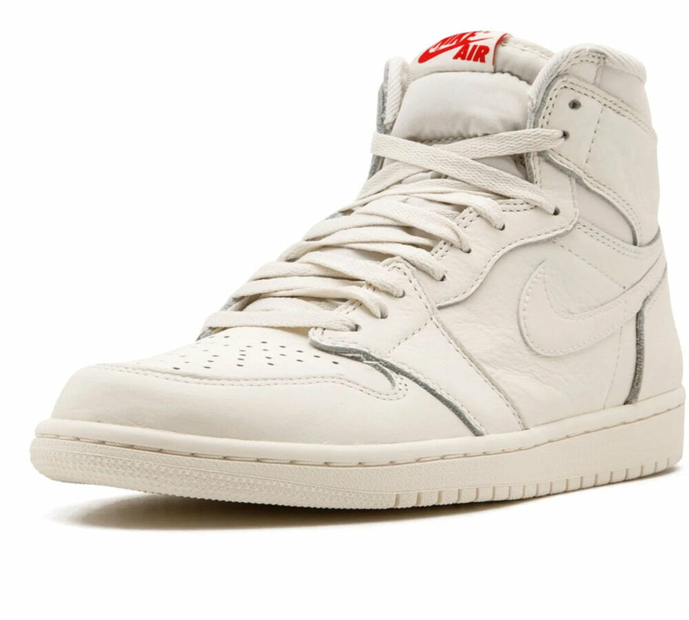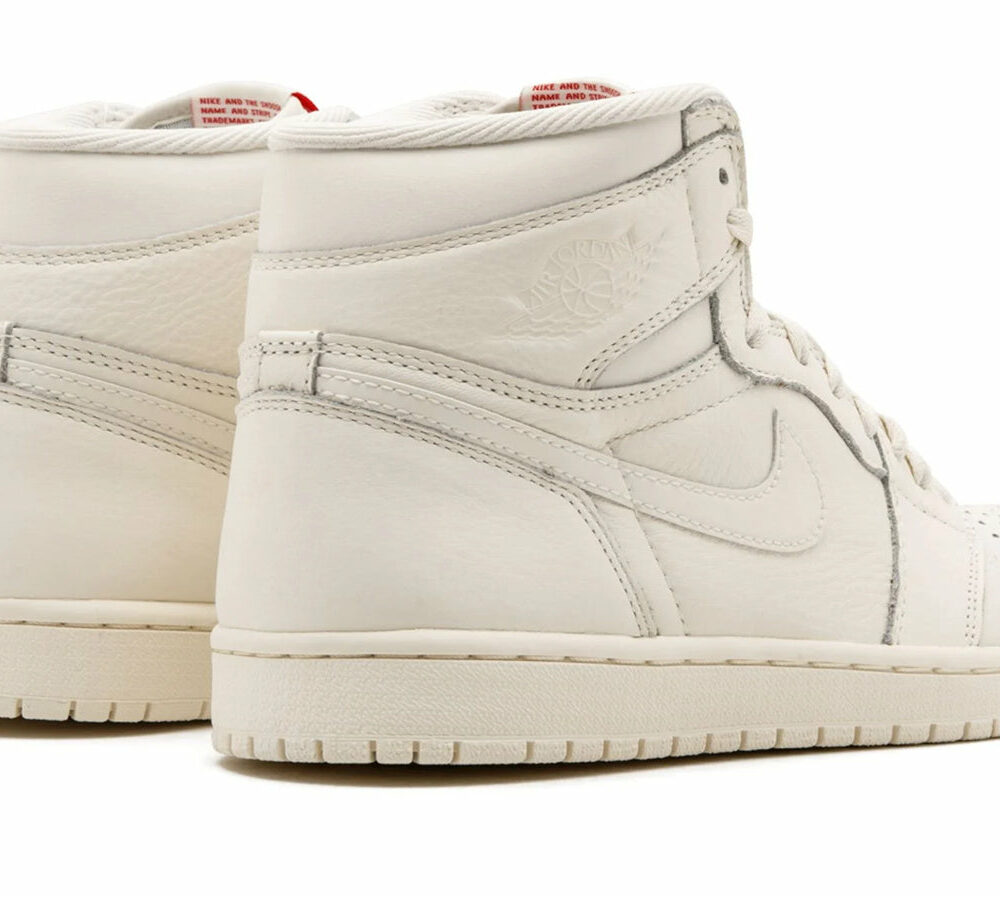 This Air Jordan 1 sneaker features a monochromatic leather upper in Sail White leather. University Red ‘Nike Air’ branding on the tongue tag provides a contrasting tone to the upper. Other details include tonal Swooshes on the sides, a recessed ‘Wings’ logo on the outer collar flap, toe box perforations, and white laces. A Sail White rubber sole unit matching the upper rounds out the design.