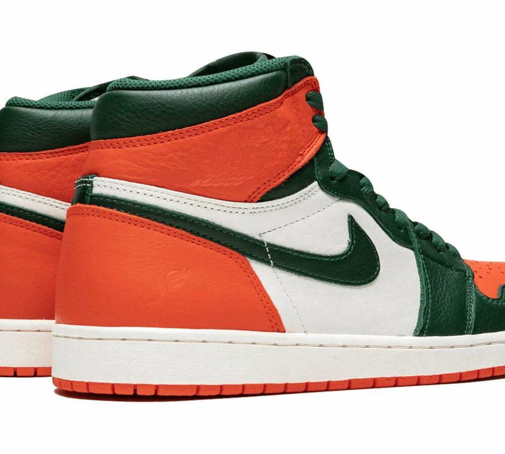Get those University of Miami vibes straight from the new Jordan 1 Retro High SoleFly Art Basel Sail like never before. This AJ1 comes with a white upper plus green and orange accents, green Nike "Swoosh", white midsole, and orange sole. These sneakers released in December 2018.