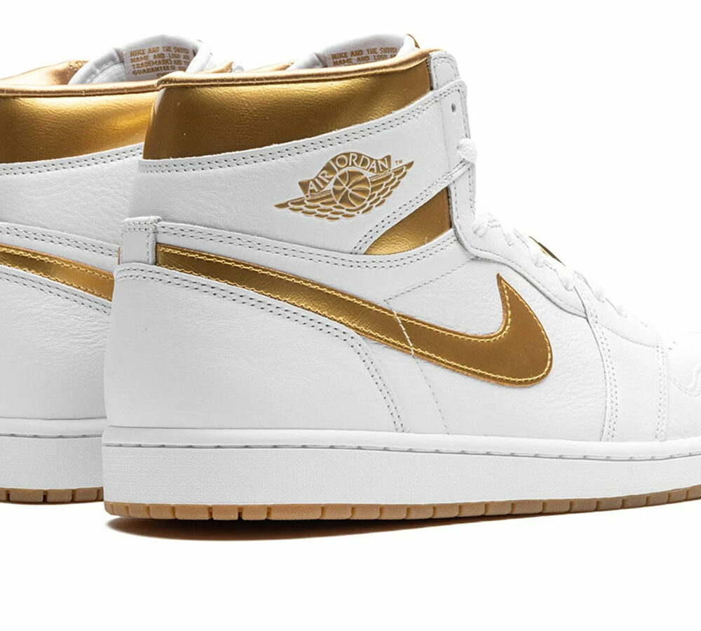 The sneaker features a retro, high-top design, inspired by the original Air Jordan 1, with leather overlays in Tonal White. Metallic Gold can be found across the Swooshes on the side panels, around the collar, and on the Jordan Wings logo. In addition, the tongue boasts a logo tag with a clean white base and Metallic Gold stitching. Like other versions of the Jordan 1 Retro High OG, the Metallic Gold variation features perforations across the vamp that allow the foot to breathe. The rubber outsole comes in Gum Light Brown and complements the gold accents.