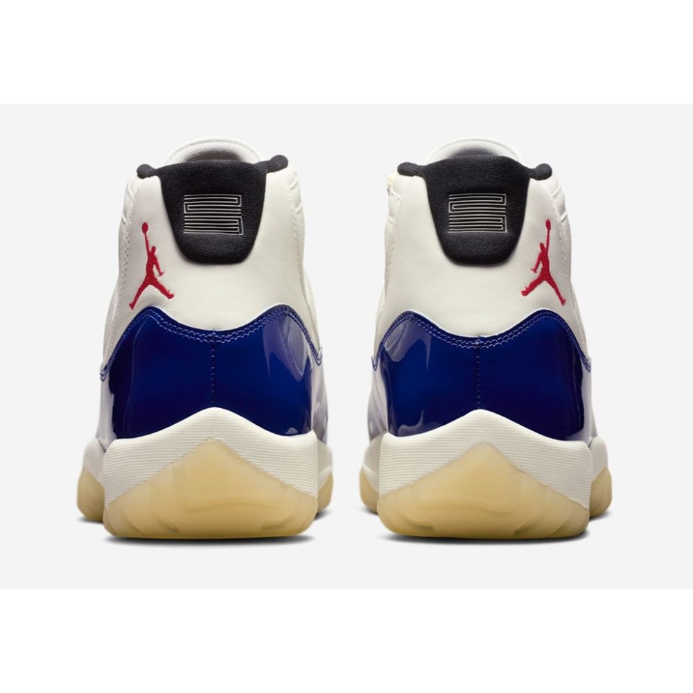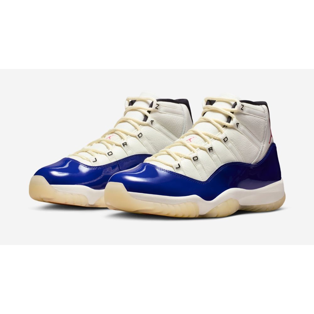 The Air Jordan 11 "Rare Air" drops Holiday 2025. A white leather upper contrasts with a deep royal blue patent leather mudguard and fire red accents. The iconic silhouette features a sail midsole and translucent outsole. A must-have for Jordan collectors.