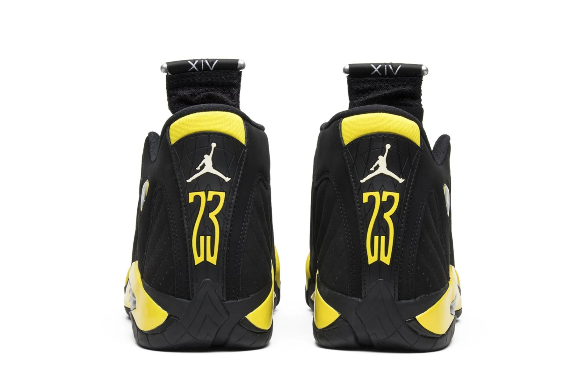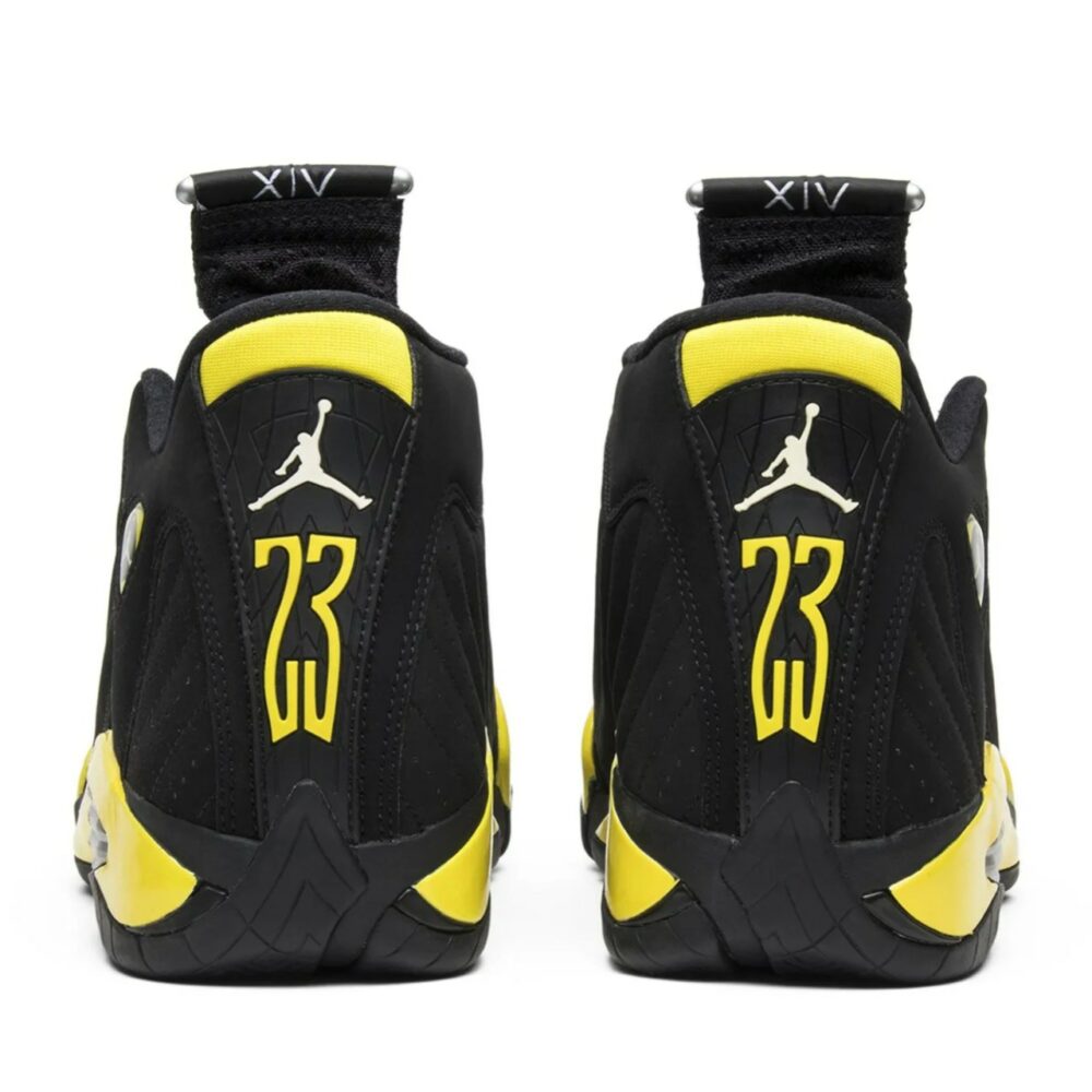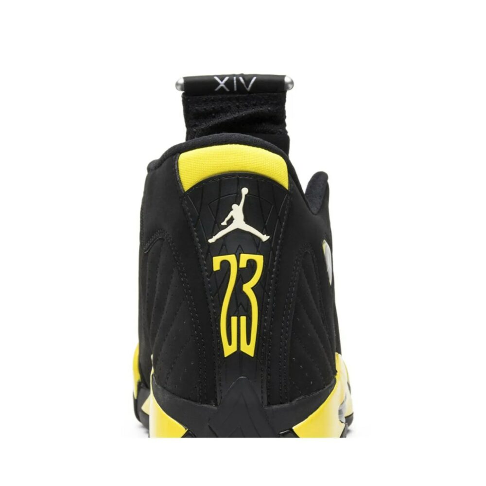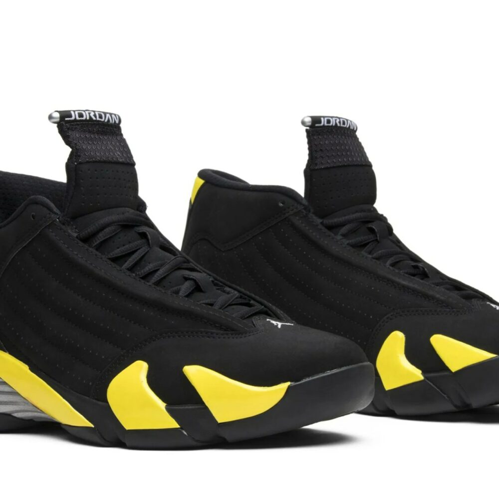 Notably absent since 2012, the Air Jordan 14 returned to shelves in 2014 in four colorways, the ‘Sport Blue,’ ‘Ferrari,’ ‘Black Toe,’ and ‘Thunder.’ Taking a cue from the Air Jordan 4 ‘Thunder,’ the Air Jordan 14 Retro ‘Thunder’ release sees a primarily black suede upper with yellow accents on the midsole and branding.