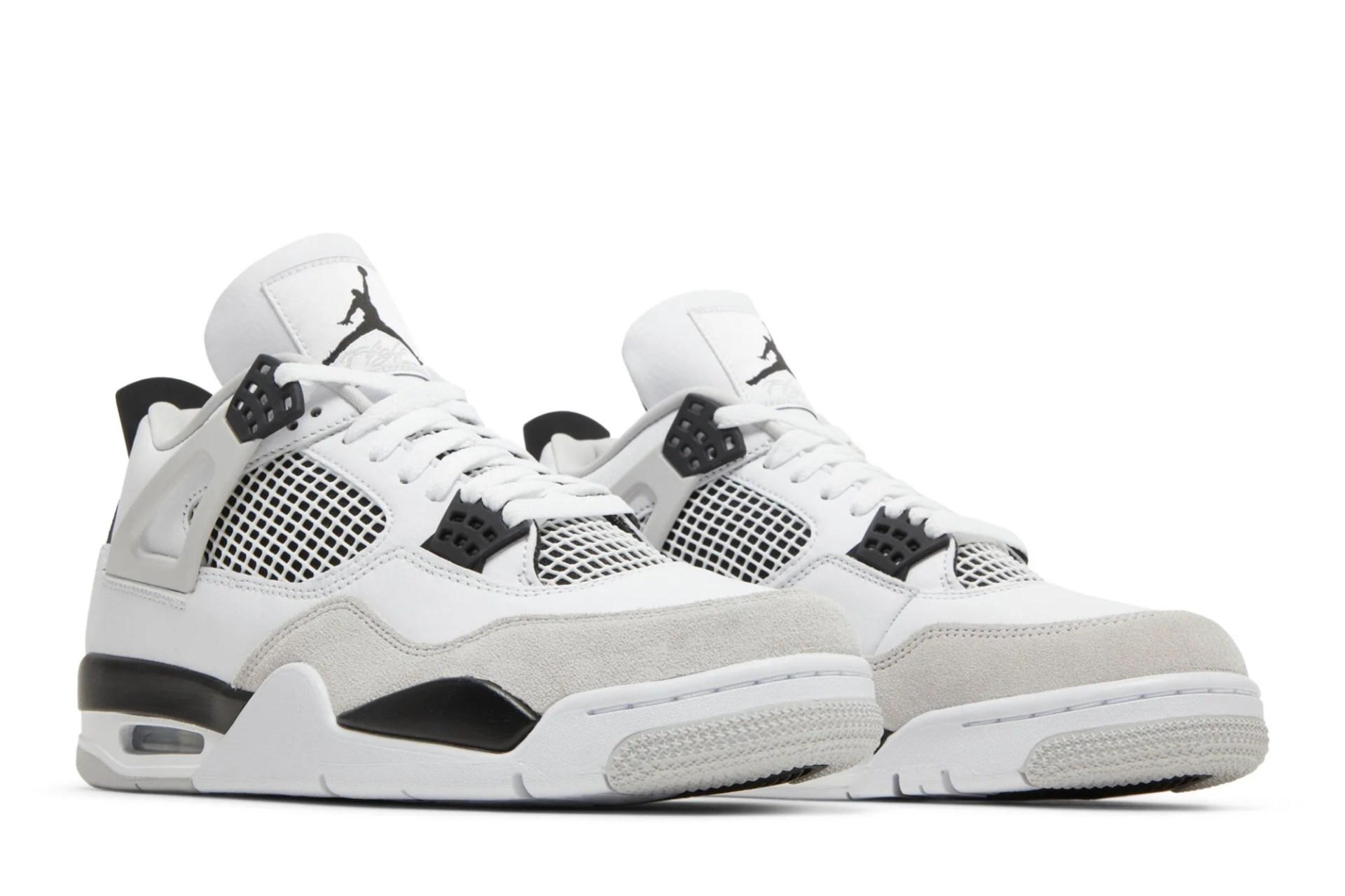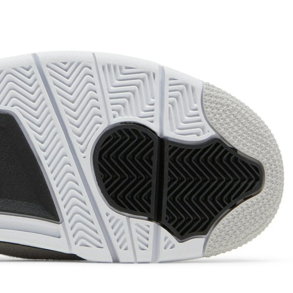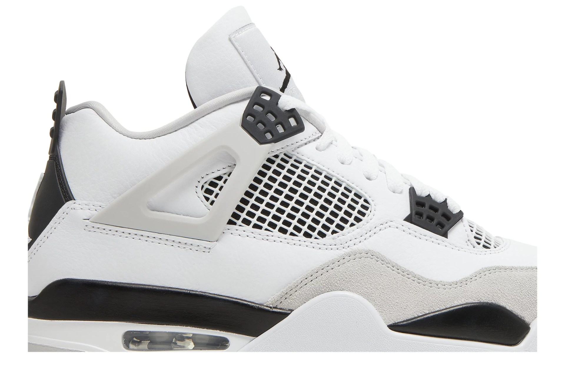 The Air Jordan 4 Retro Military Black showcases the same color blocking and materials featured on the OG Military Blue colorway from 1989. Smooth white leather is utilized on the upper, bolstered with a forefoot overlay in grey suede. Contrasting black accents make their way to the TPU eyelets, molded heel tab, and the Jumpman logo displayed on the woven tongue tag. Lightweight cushioning comes courtesy of a two-tone polyurethane midsole, enhanced with a visible Air-sole unit under the heel.