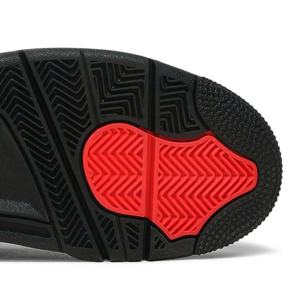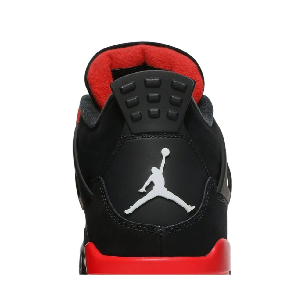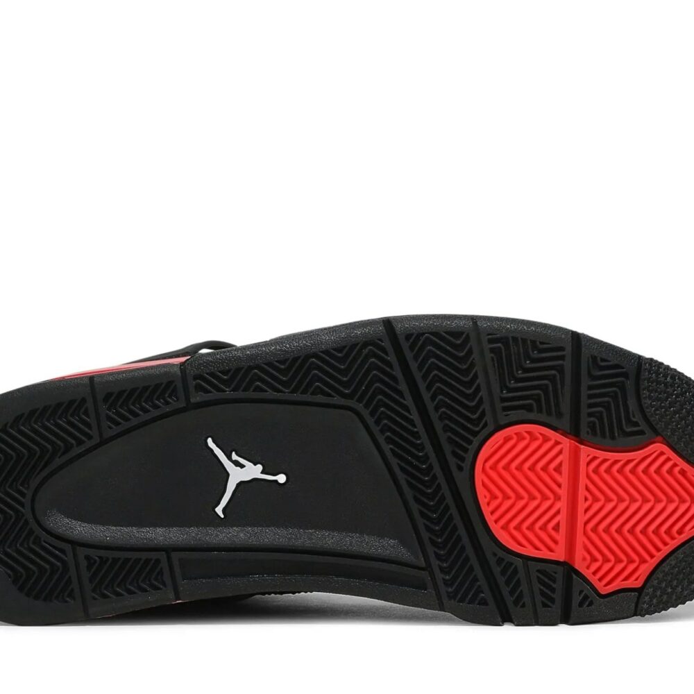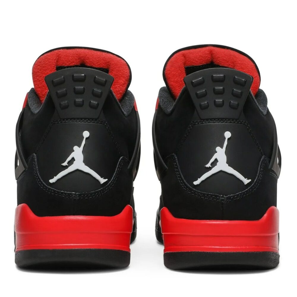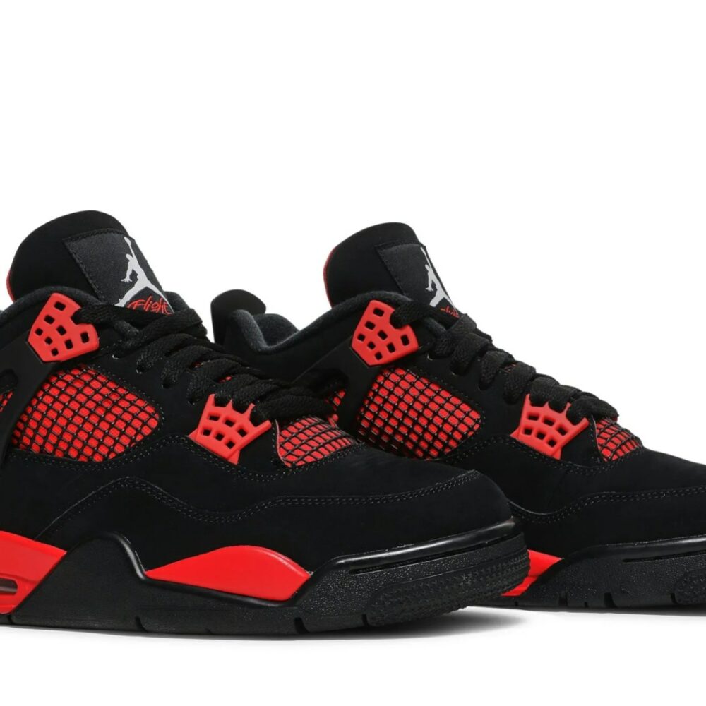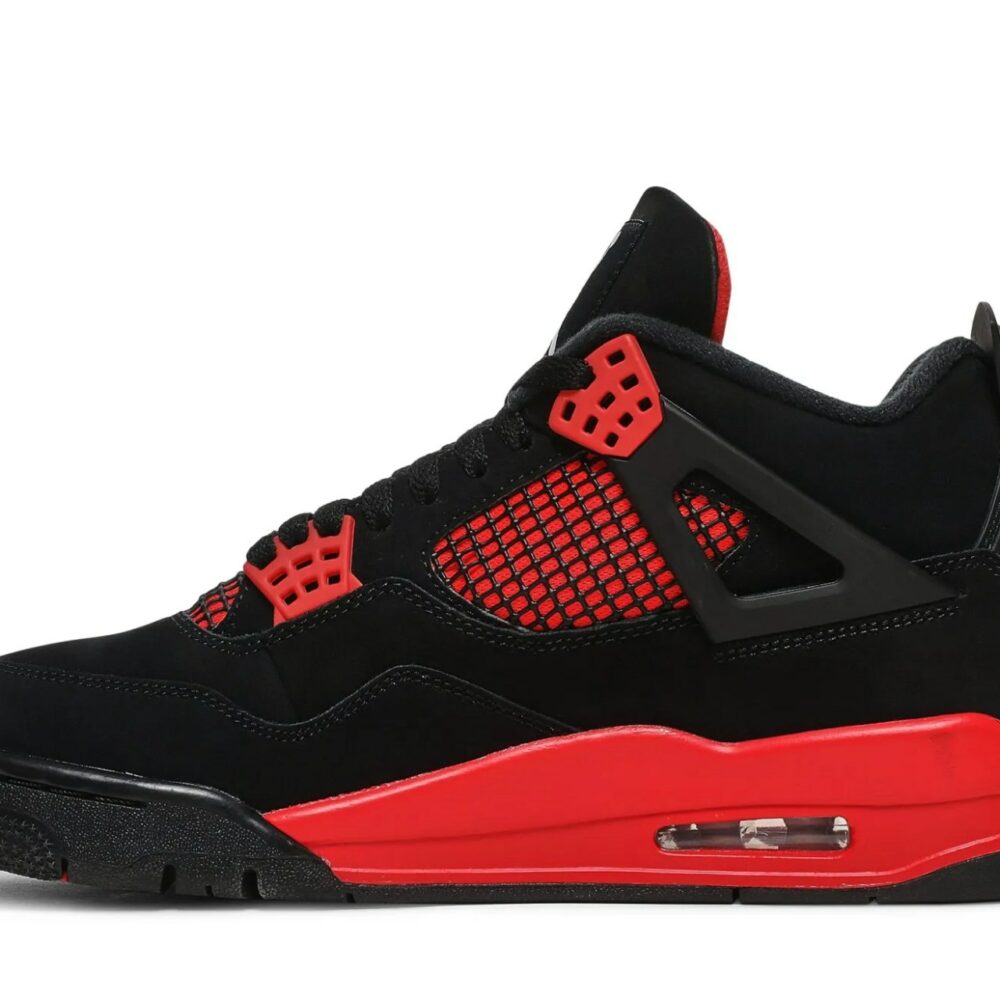 The Air Jordan 4 Retro Red Thunder, also known as 'Crimson', features familiar color blocking that recalls the coveted Thunder colorway, originally released in 2006 and subsequently reissued in 2012. The mid-top sports a black nubuck upper with contrasting pops of crimson in lieu of the older shoes Tour Yellow accents. They appear on the sneakers molded eyelets, interior tongue, quarter panel, throat and midsole, which packs visible Air-sole cushioning under the heel. Jumpman branding decorates the tongue tag and heel.