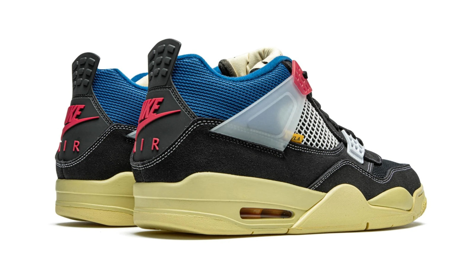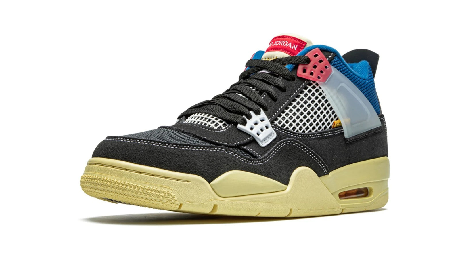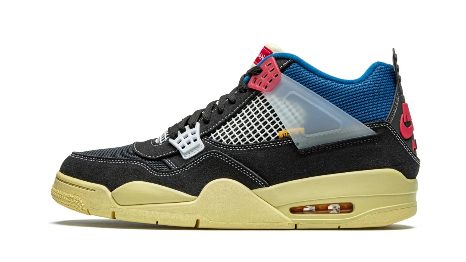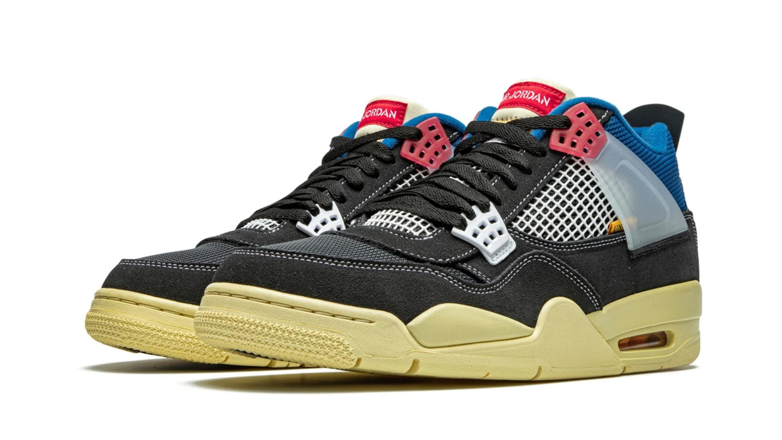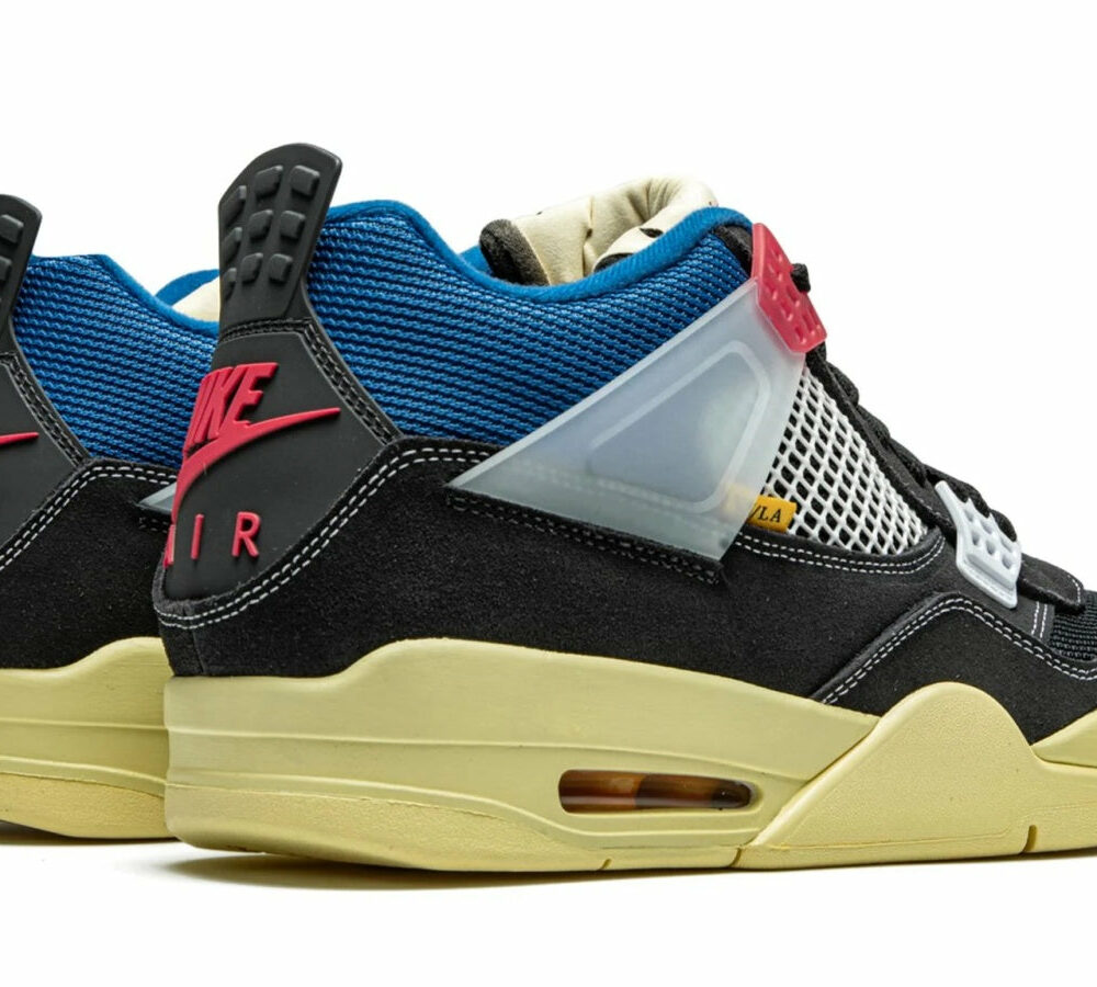 As a sequel to the Union x Nike Air Jordan 1s, the Union x Air Jordan 4 capsule is extremely hyped. The "Off Noir" offering features a black nubuck upper, but is far from being understated. While the signature mesh, eyelets and translucent ankle straps come in white, the NIKE brandings are in bright red. To take the pair to the next level, a vibrant blue ankle collar and dark cream midsole add more colors to the mix.