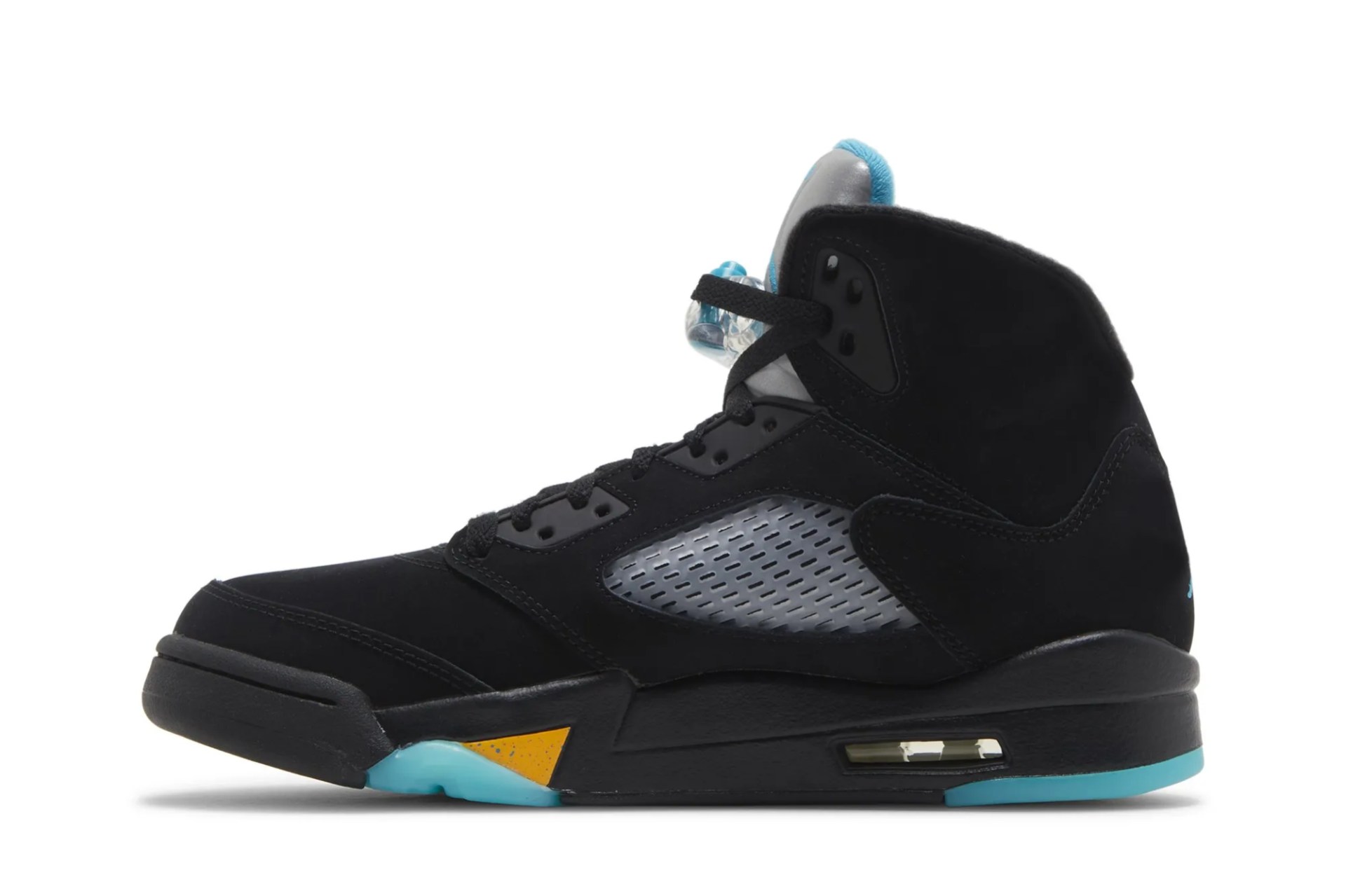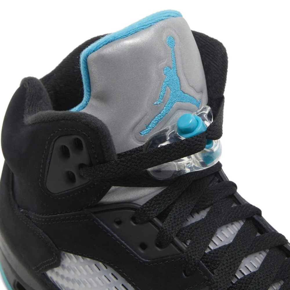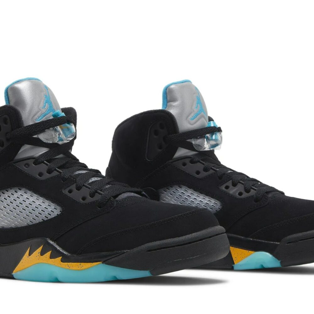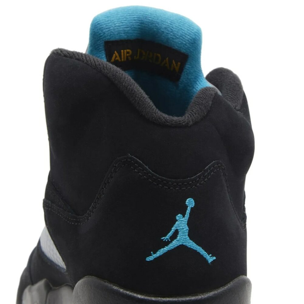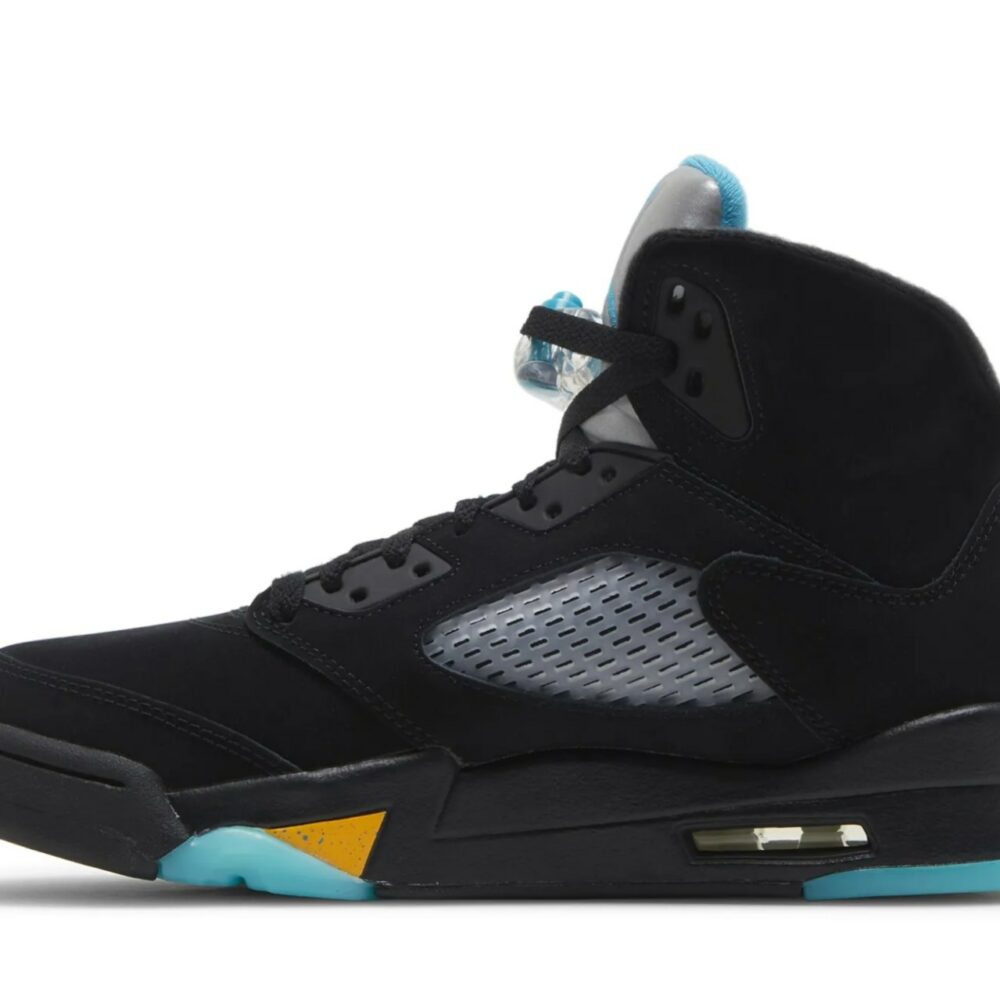 The Air Jordan 5 Retro ‘Aqua’ showcases a distinctive color scheme that recalls an AJ5 PE made for Chris Paul during his time with the New Orleans Hornets. The legacy silhouette makes use of a black nubuck upper with translucent quarter-panel netting for improved breathability. A bright teal Jumpman decorates the back heel and silver reflective tongue. Anchoring the sneaker is a black polyurethane midsole, featuring speckled yellow shark-tooth detailing and visible Air-sole cushioning in the heel. Finished in a vibrant turquoise hue, a translucent rubber outsole yields durable traction.