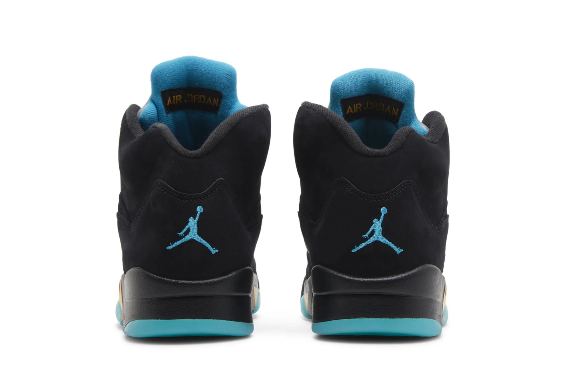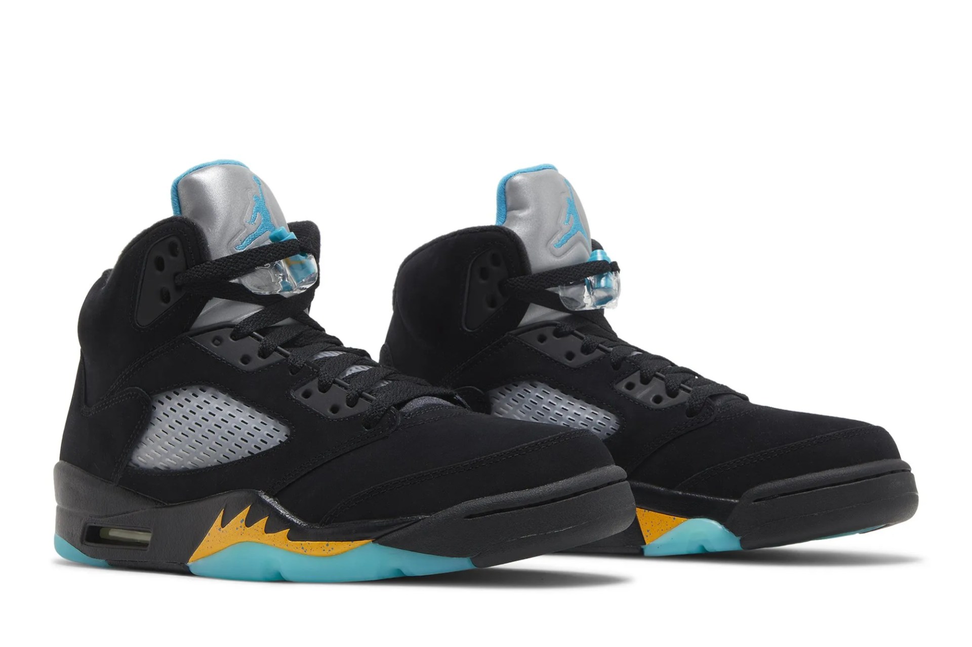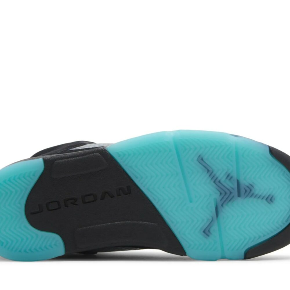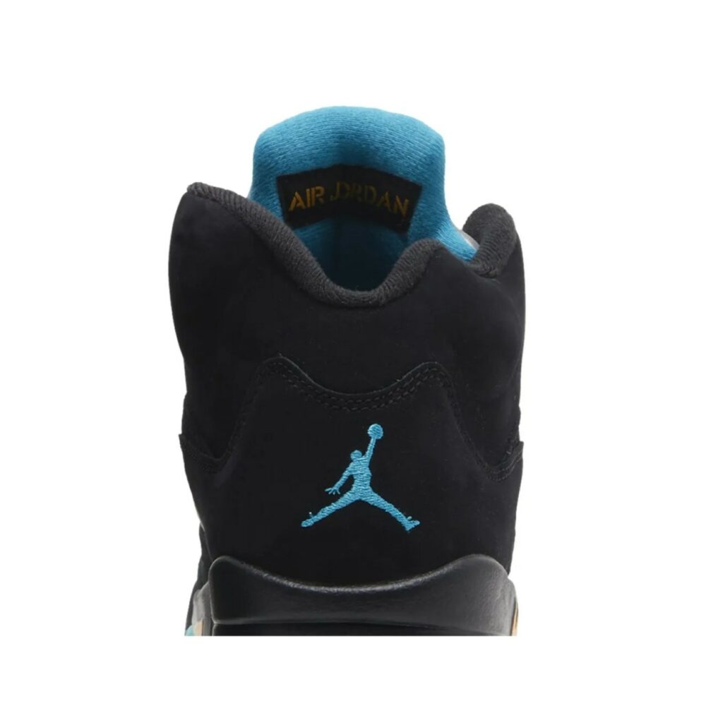 The Air Jordan 5 Retro ‘Aqua’ showcases a distinctive color scheme that recalls an AJ5 PE made for Chris Paul during his time with the New Orleans Hornets. The legacy silhouette makes use of a black nubuck upper with translucent quarter-panel netting for improved breathability. A bright teal Jumpman decorates the back heel and silver reflective tongue. Anchoring the sneaker is a black polyurethane midsole, featuring speckled yellow shark-tooth detailing and visible Air-sole cushioning in the heel. Finished in a vibrant turquoise hue, a translucent rubber outsole yields durable traction.