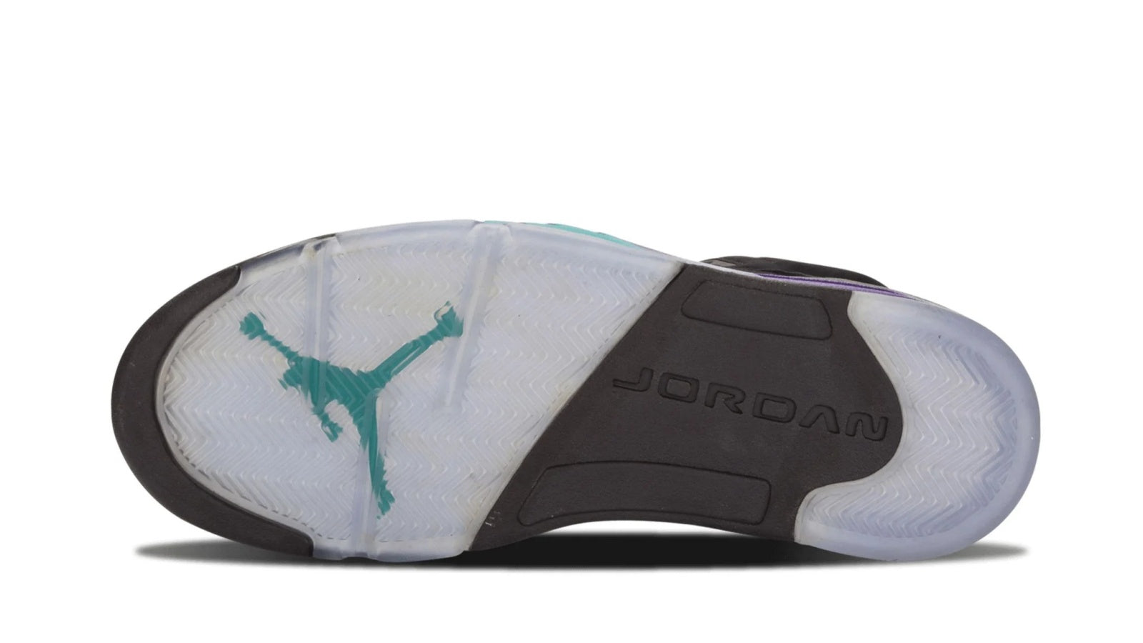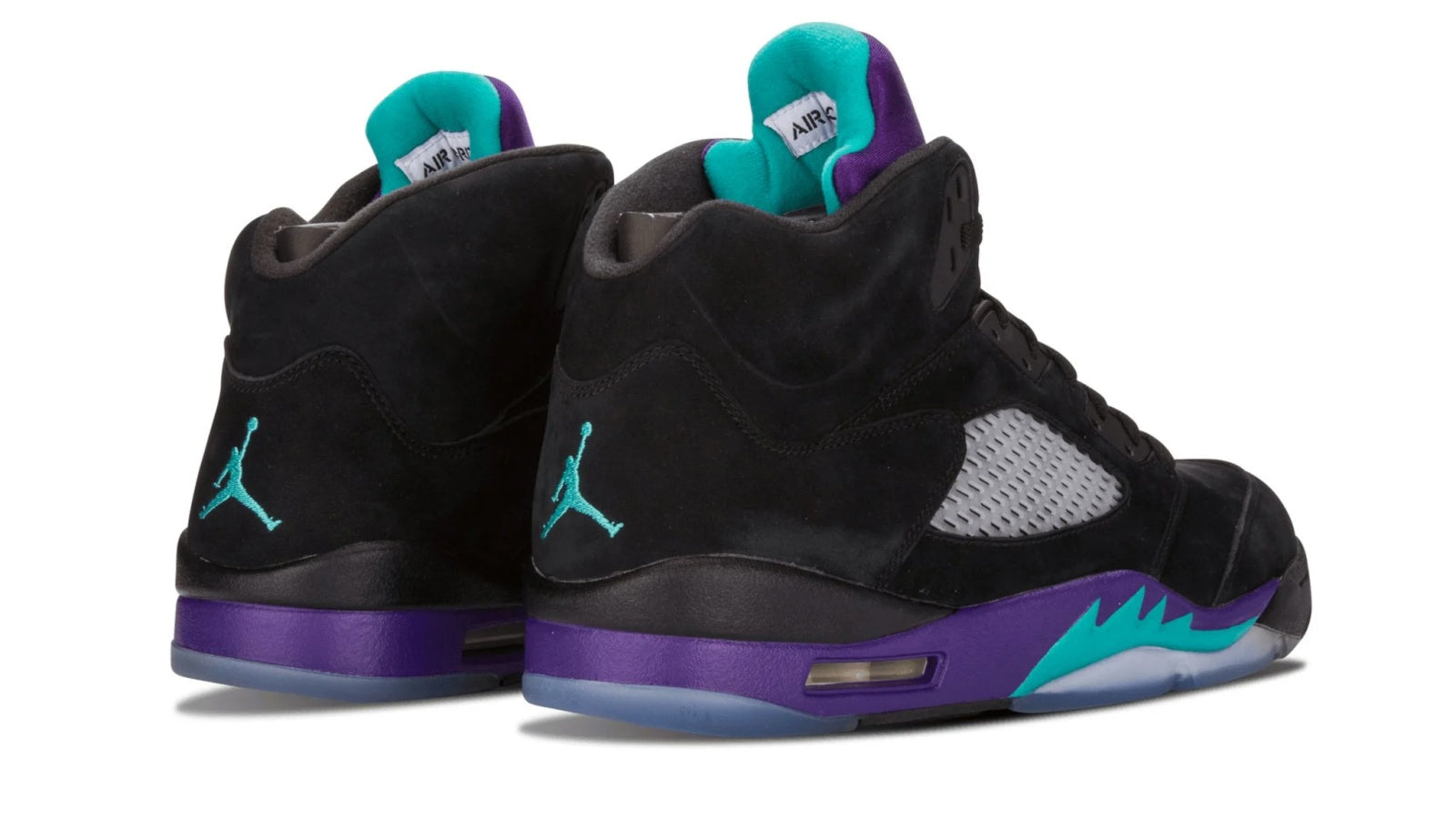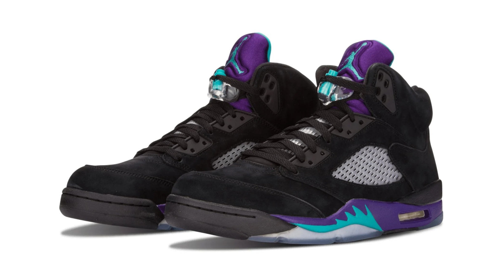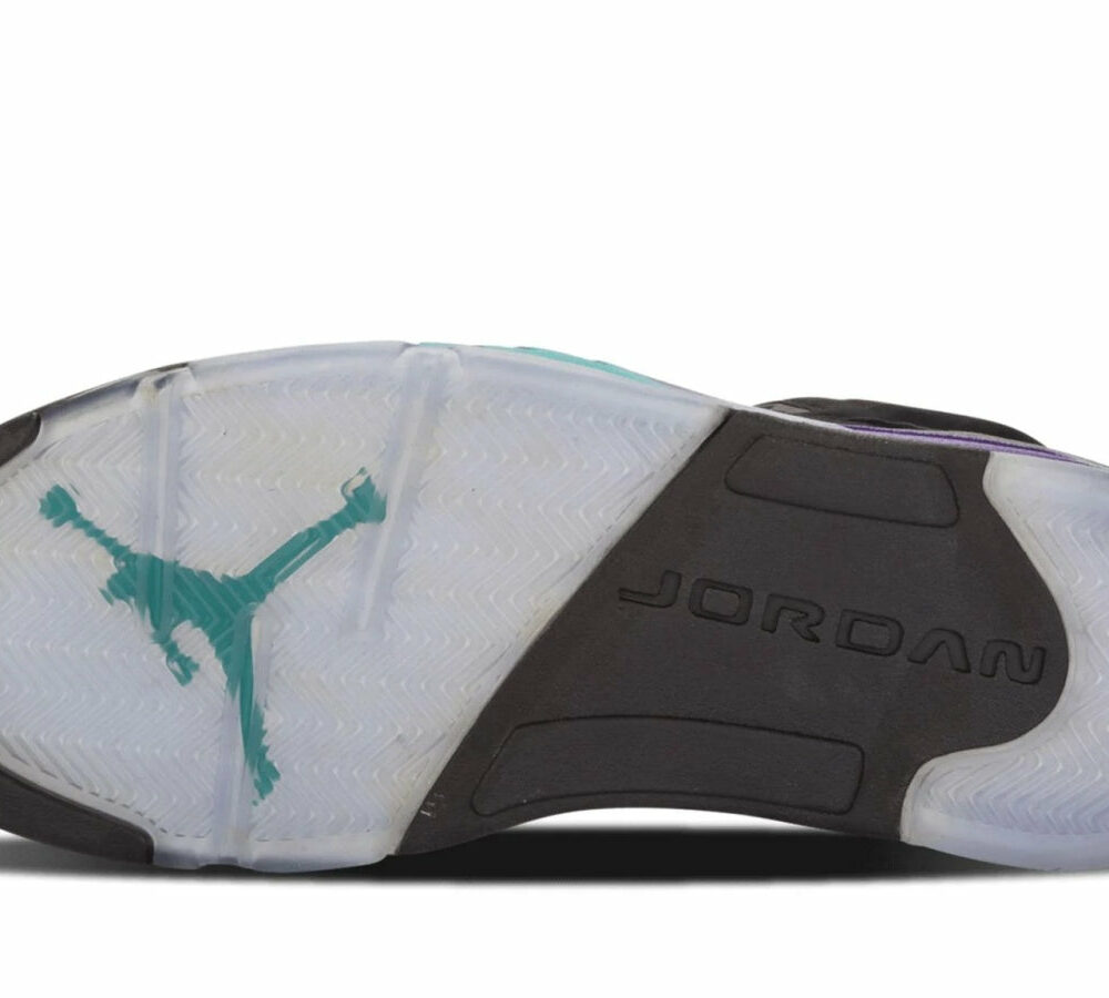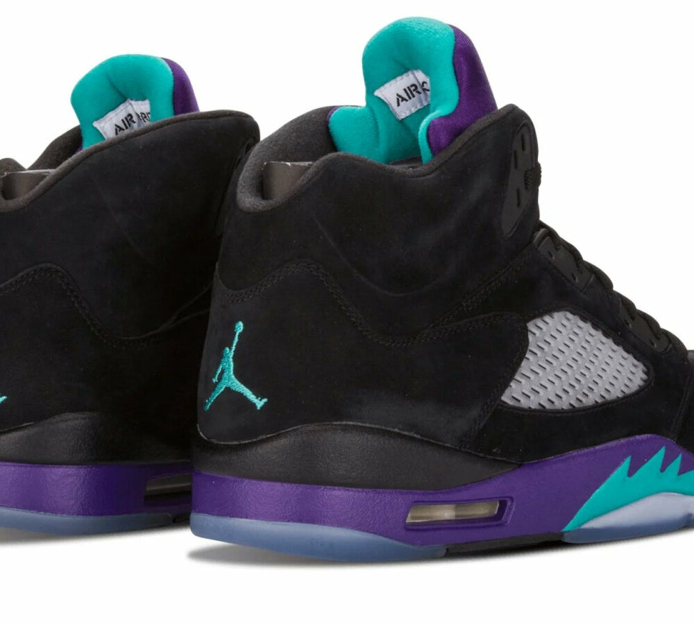 The Nike Air Jordan 5 Retro 'Black Grape' is a must-have sneaker for any true Jordan fan. The sleek black nubuck upper is accented perfectly by New Emerald and Grape Ice details, making this one of the most eye-catching sneakers on the market. The icy blue translucent outsole completes the look, and provides superior traction and comfort. Whether you're hitting the court or just hitting the streets, the Air Jordan 5 Retro 'Black Grape' is a sneaker that won't disappoint.