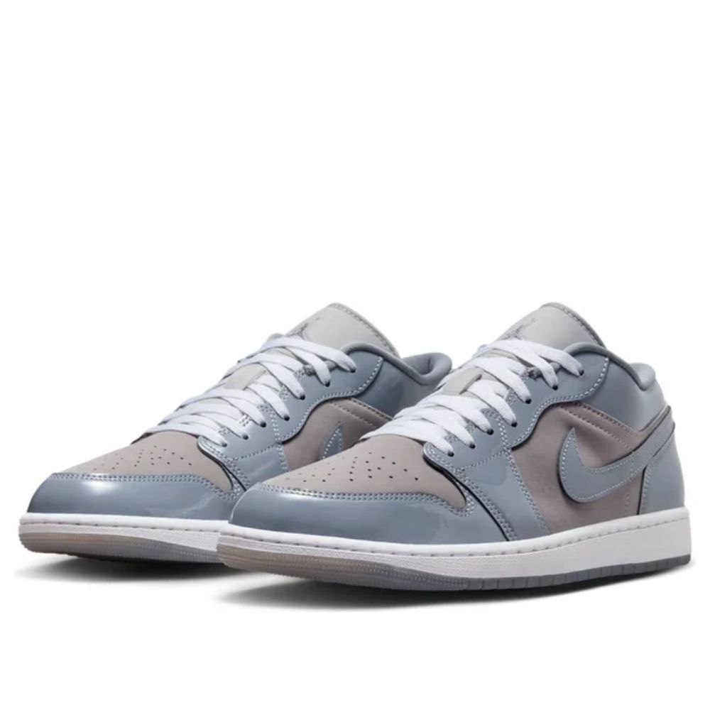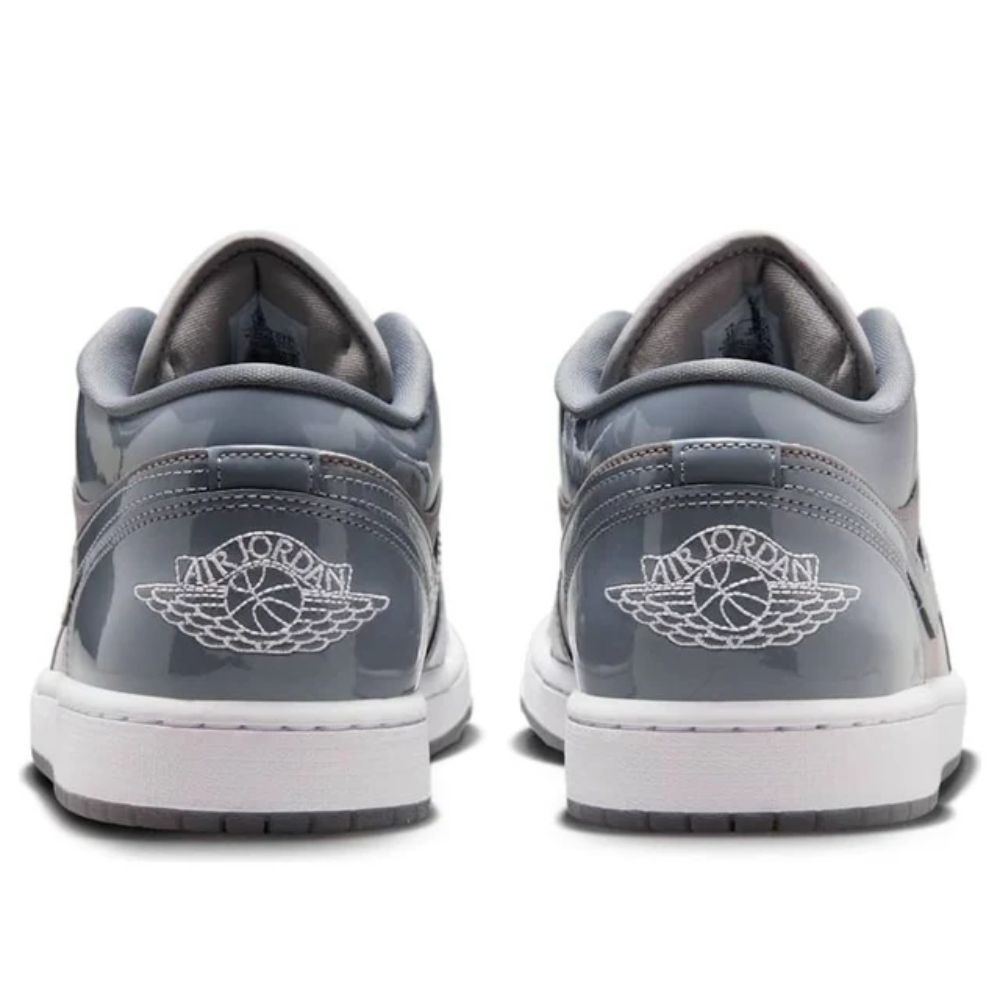 The Medium Grey Cool Grey White 1 Low SE by Jordan applies smooth white leather across the quarter, lace placket, and heel counter. Medium grey patent leather wraps around the heel, collar, and Swoosh, and the perforated toe box and forefoot panels are a subtle cool grey. Underfoot, there's Air-sole cushioning in a white foam midsole paired with a semi-translucent outsole that has pivot and herringbone grip zones.