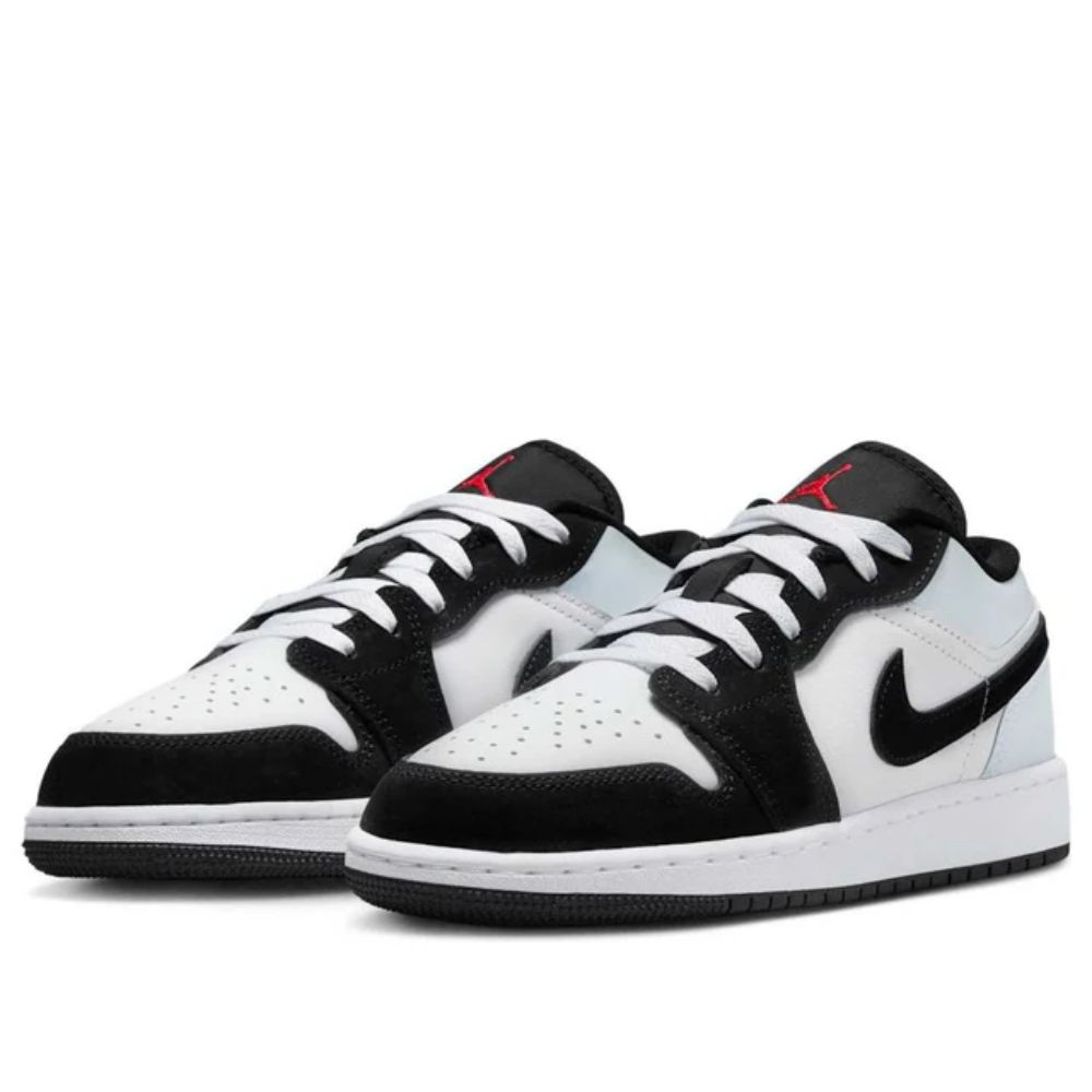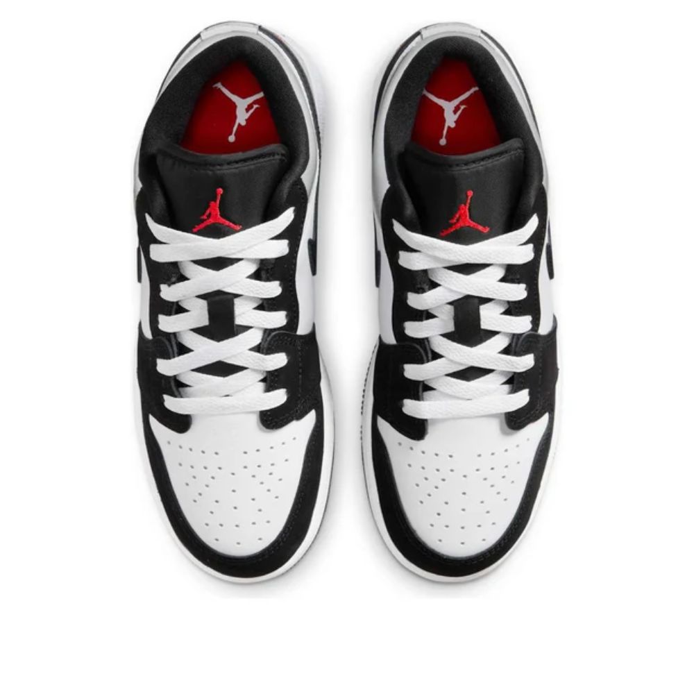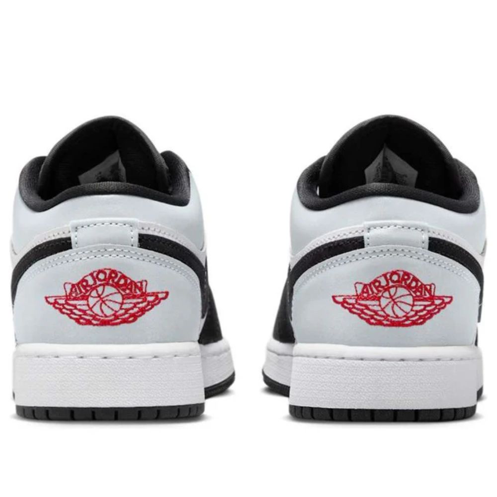 Made for big kids, the Air Jordan 1 Low GS 'Panda Toe' carries a smooth leather upper, featuring a white base with contrasting black accents on the forefoot overlay, eyestay and Swoosh. A reflective silver finish is applied to the low-cut collar and heel overlay, marked with a stitched Wings logo in Fire Red. A matching crimson Jumpman icon graces the woven tongue tag.