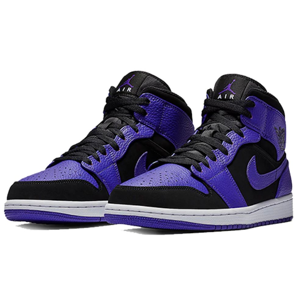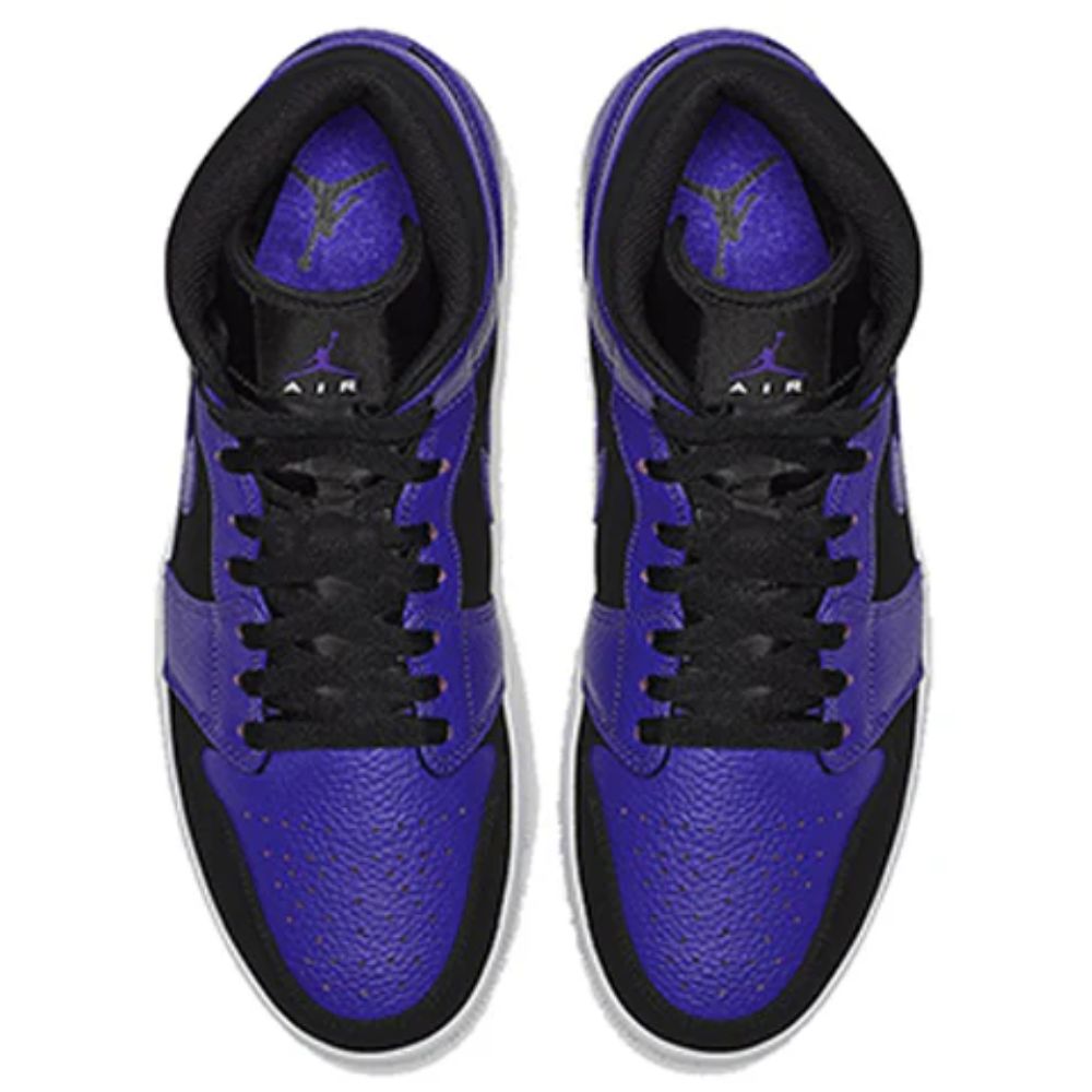 The Air Jordan 1 Mid Black Dark Concord arrives in a black, Dark Concord-white color palette.