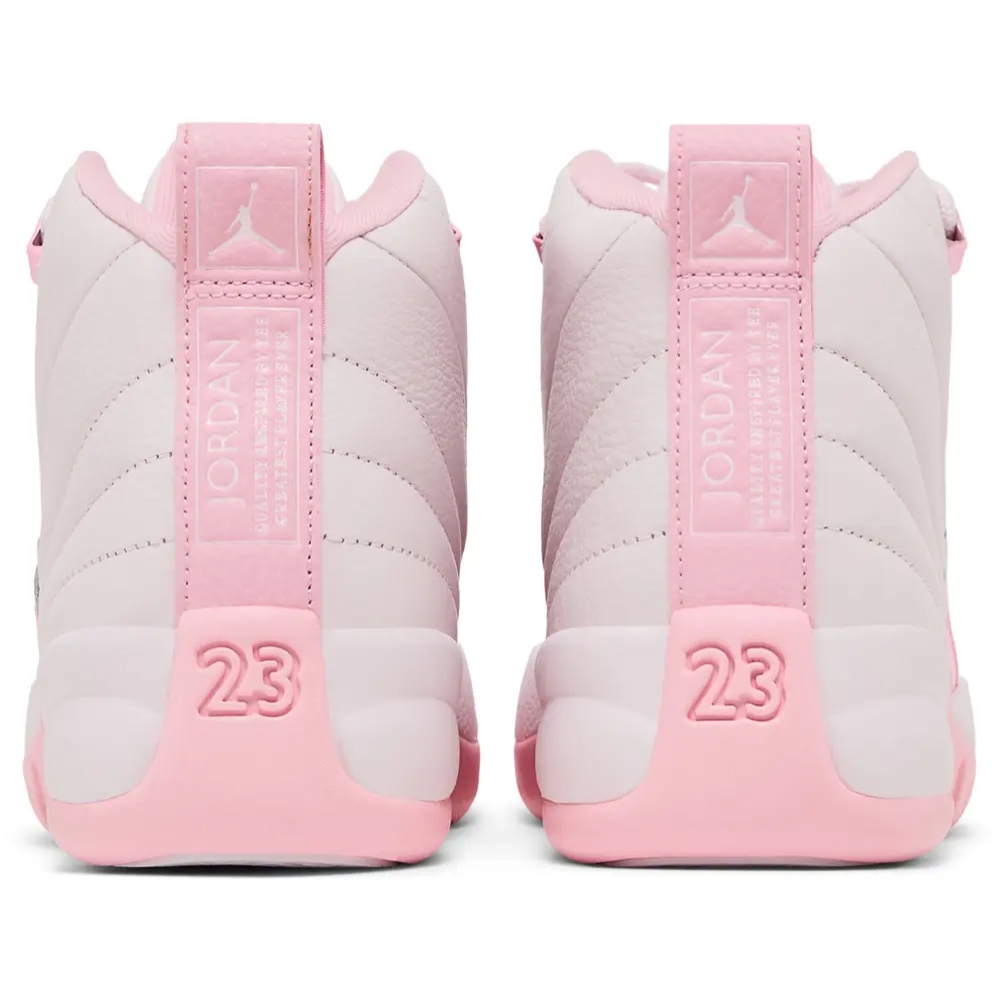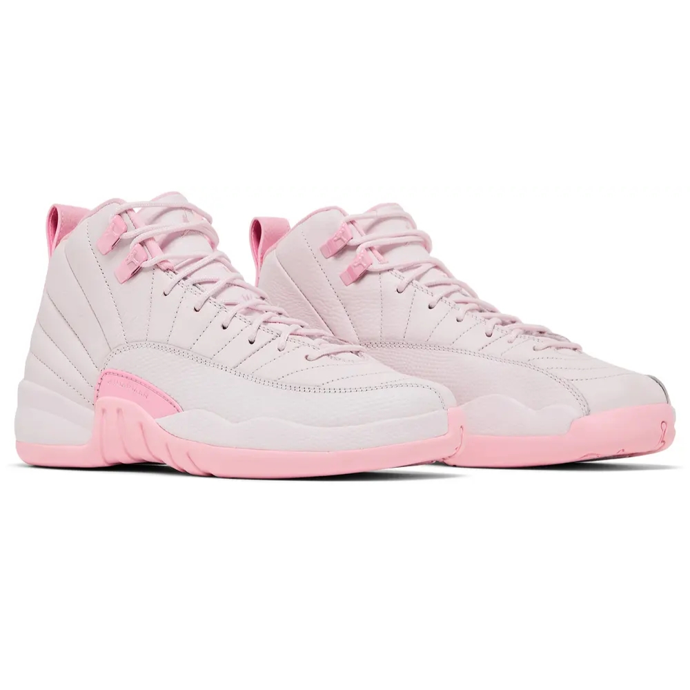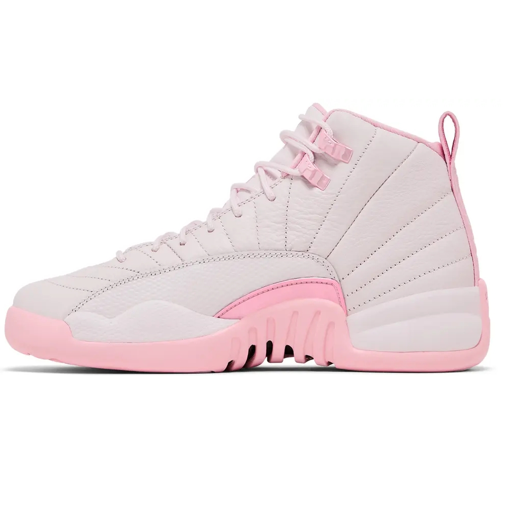 The Air Jordan 12 Retro GS 'Pearl Pink' delivers a monochrome colorway of the championship silhouette in grade school sizing. A pastel pink hue floods the tumbled leather upper, featuring radiating stitch lines and durable lizard-textured overlays. The tonal design is disrupted by lace hooks in a shiny metallic silver finish. A darker shade of pink is applied to the rubber outsole, fitted with herringbone traction pods for reliable grip.