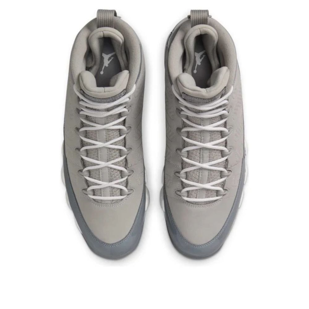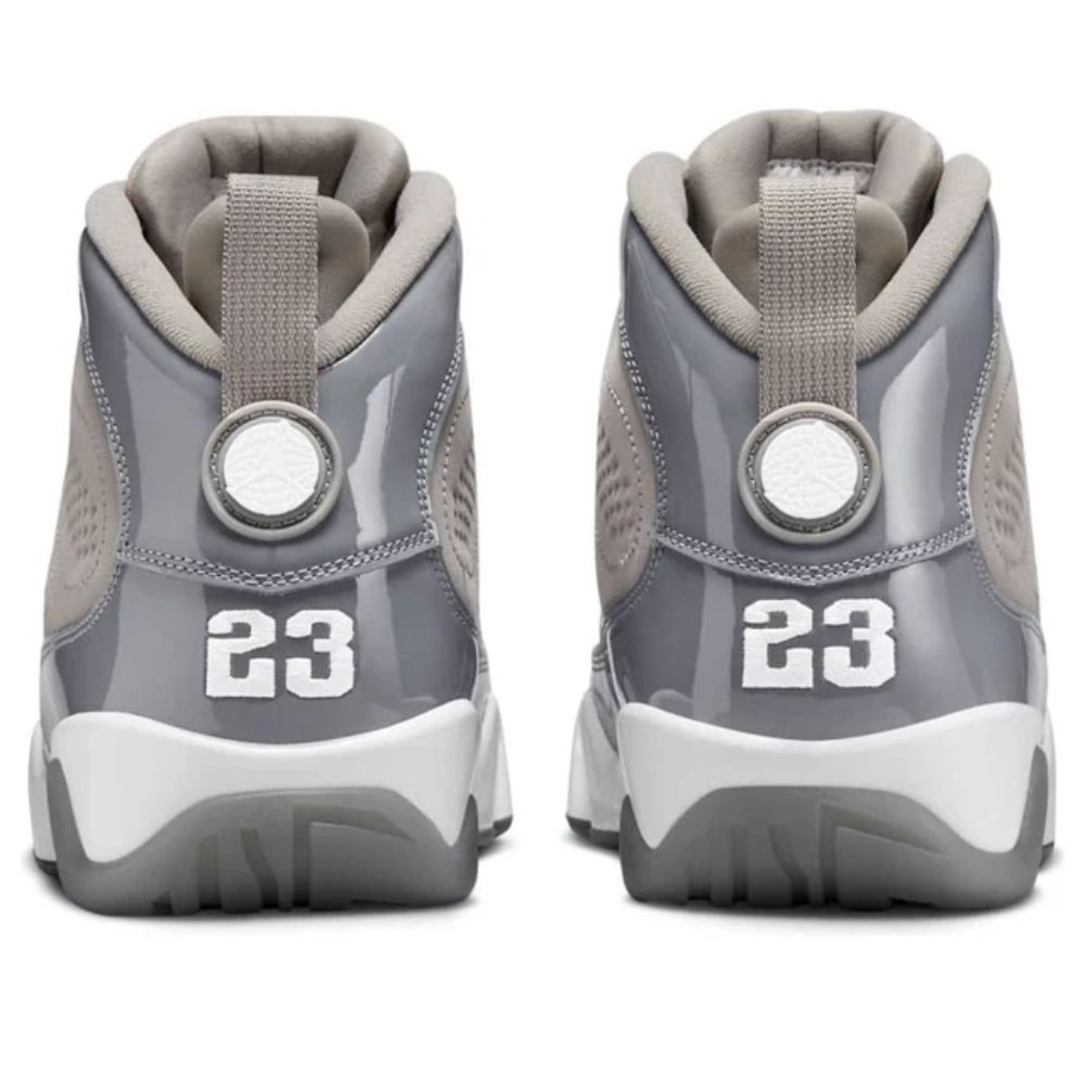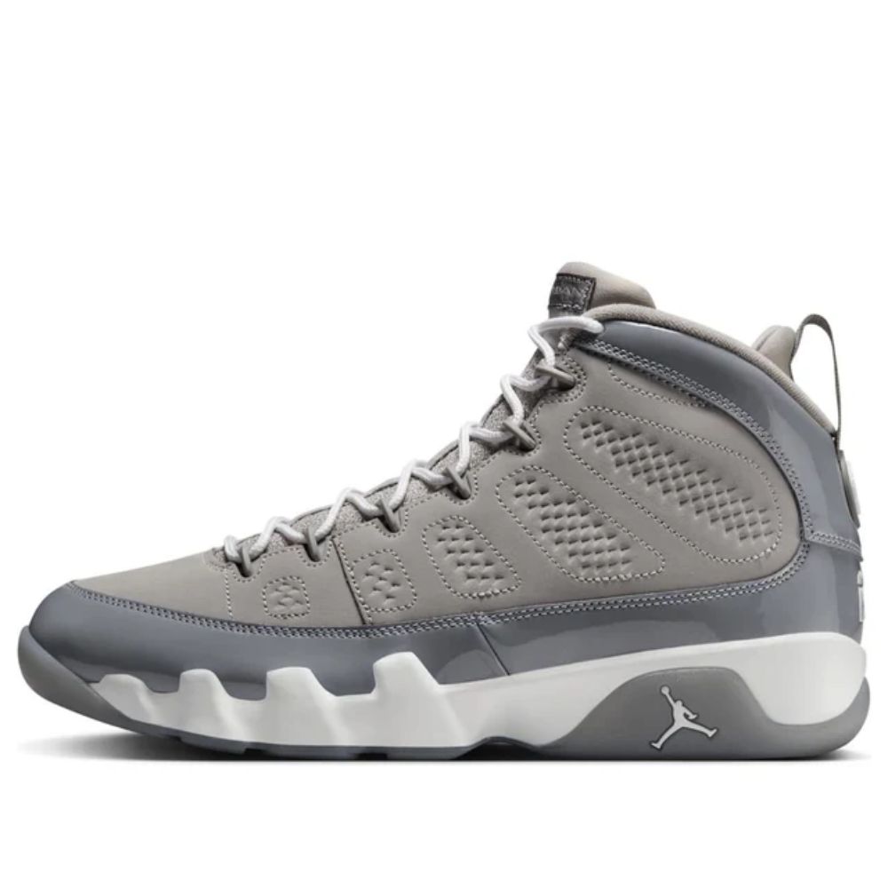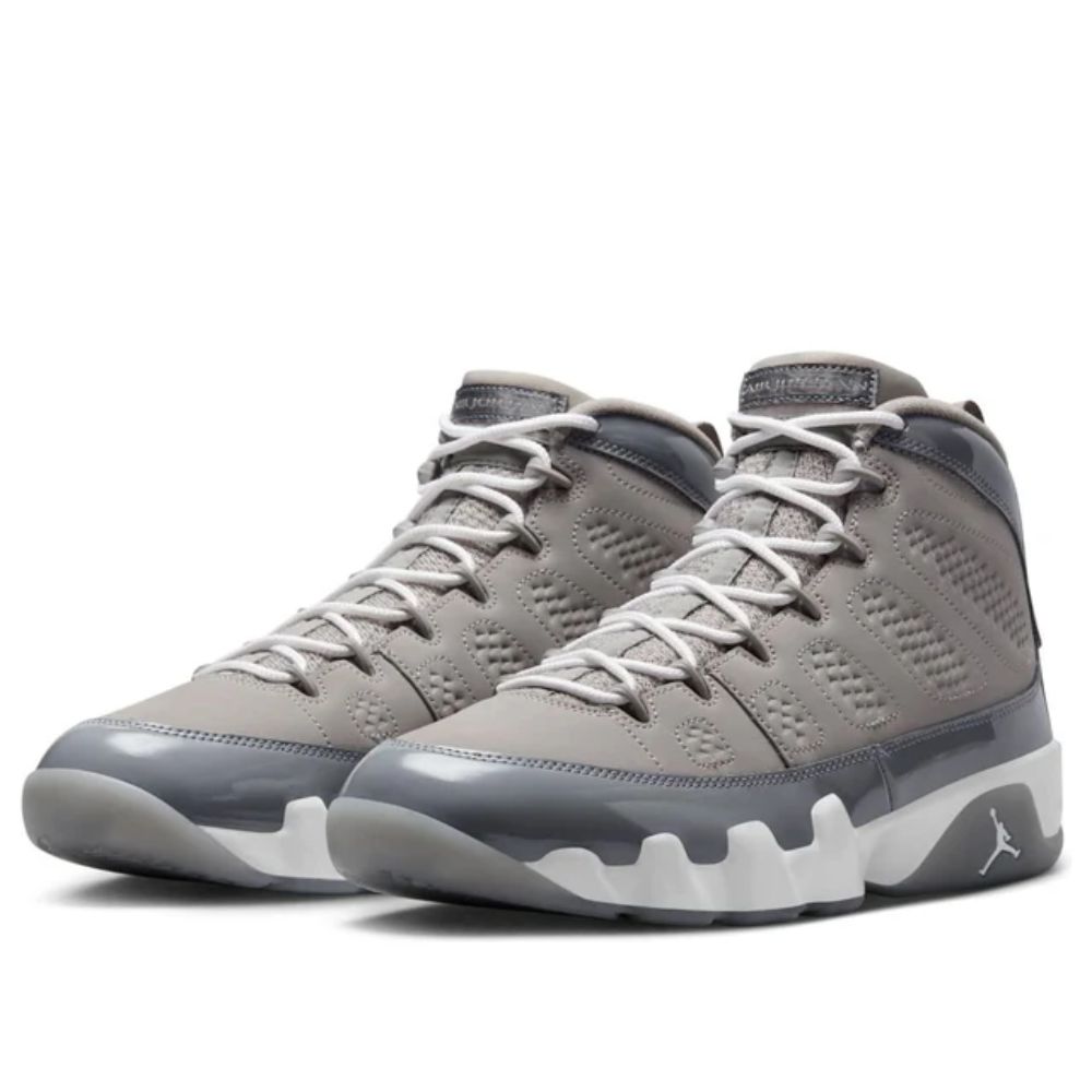 A revival of the iconic 2002 release, the Air Jordan 9 Retro 'Cool Grey' features a grey nubuck upper paired with a sleek patent leather overlay. Signature details include the Air Jordan tongue label and the classic '23' on the heel. A white foam midsole houses encapsulated Air-Sole units in the forefoot and heel for responsive cushioning, while the grey rubber outsole incorporates multilingual accents, celebrating Michael Jordan's global impact.