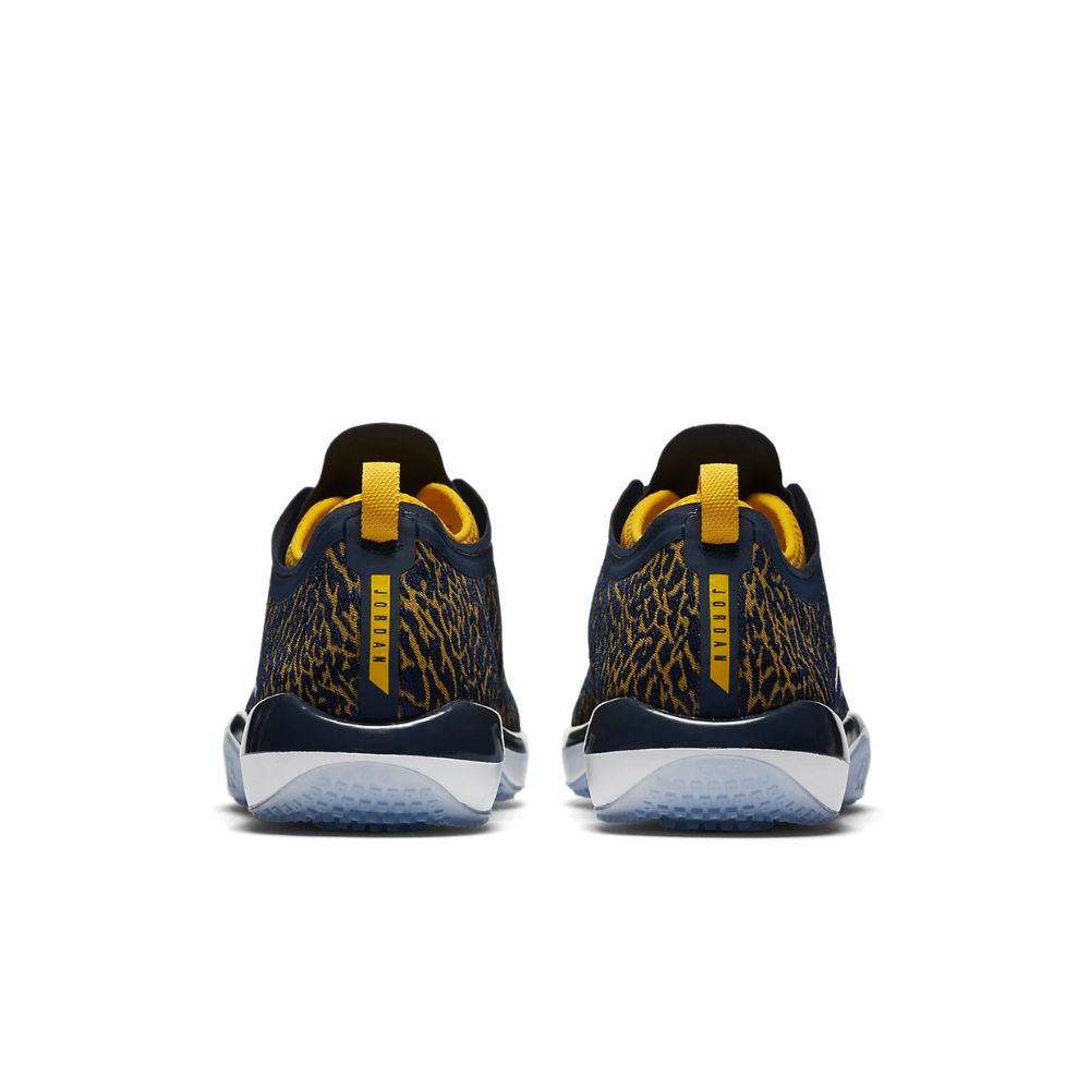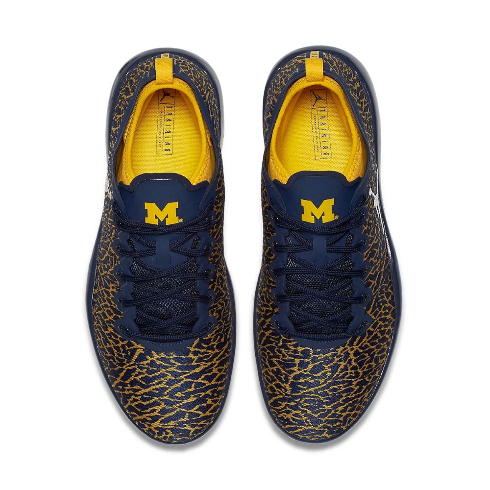 This special ‘Michigan’ colorway of the Jordan Trainer 1 Low is the first release from Nike’s partnership with the Michigan Wolverines that started in 2016. The design’s synthetic upper is dressed in iconic elephant print that pairs Wolverines colors of navy and yellow. Other signature details include a Michigan logo on the tongue, embroidered Jumpman branding on the lateral sidewall in white, and an icy translucent outsole.