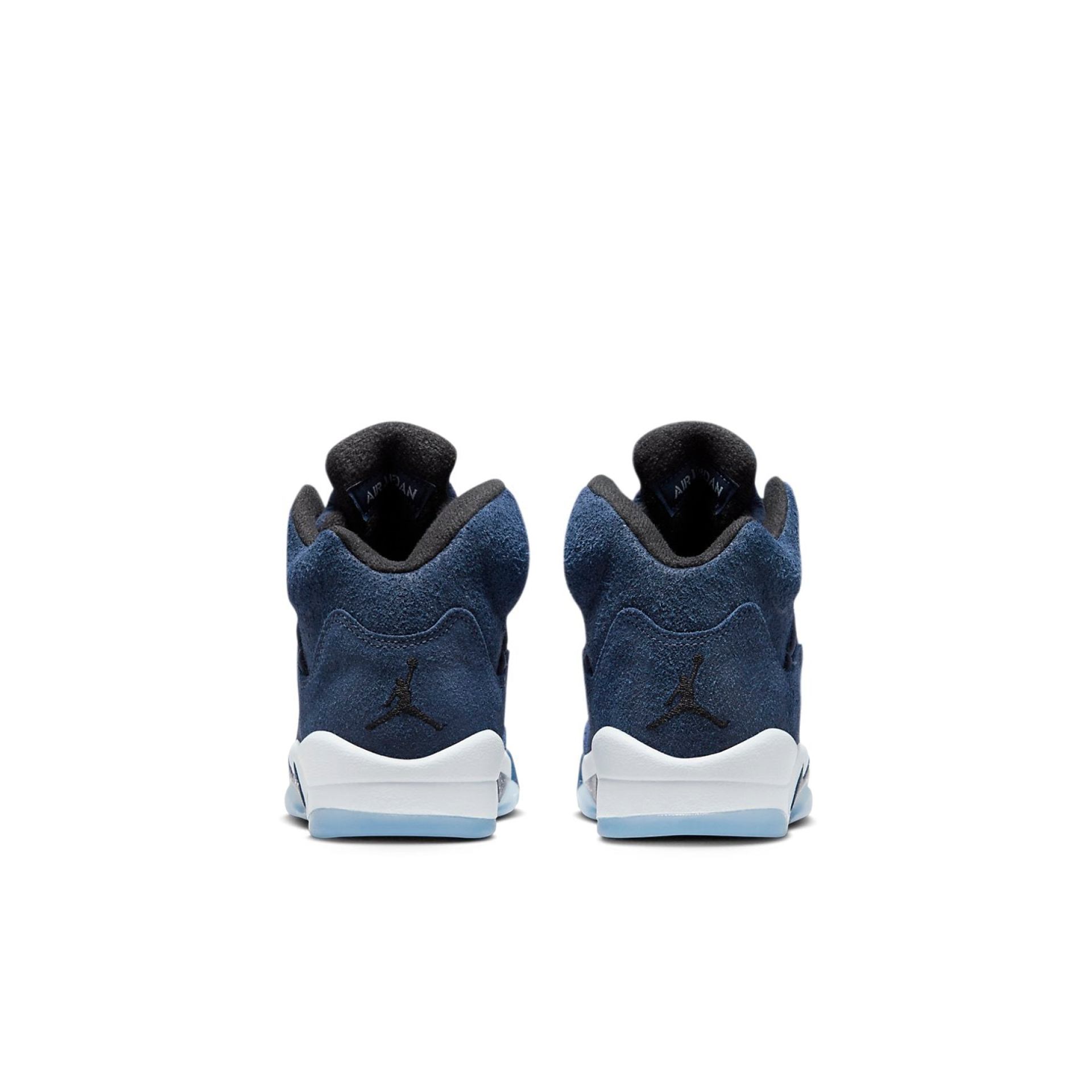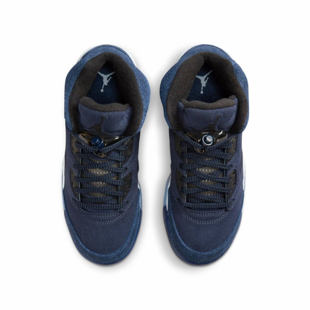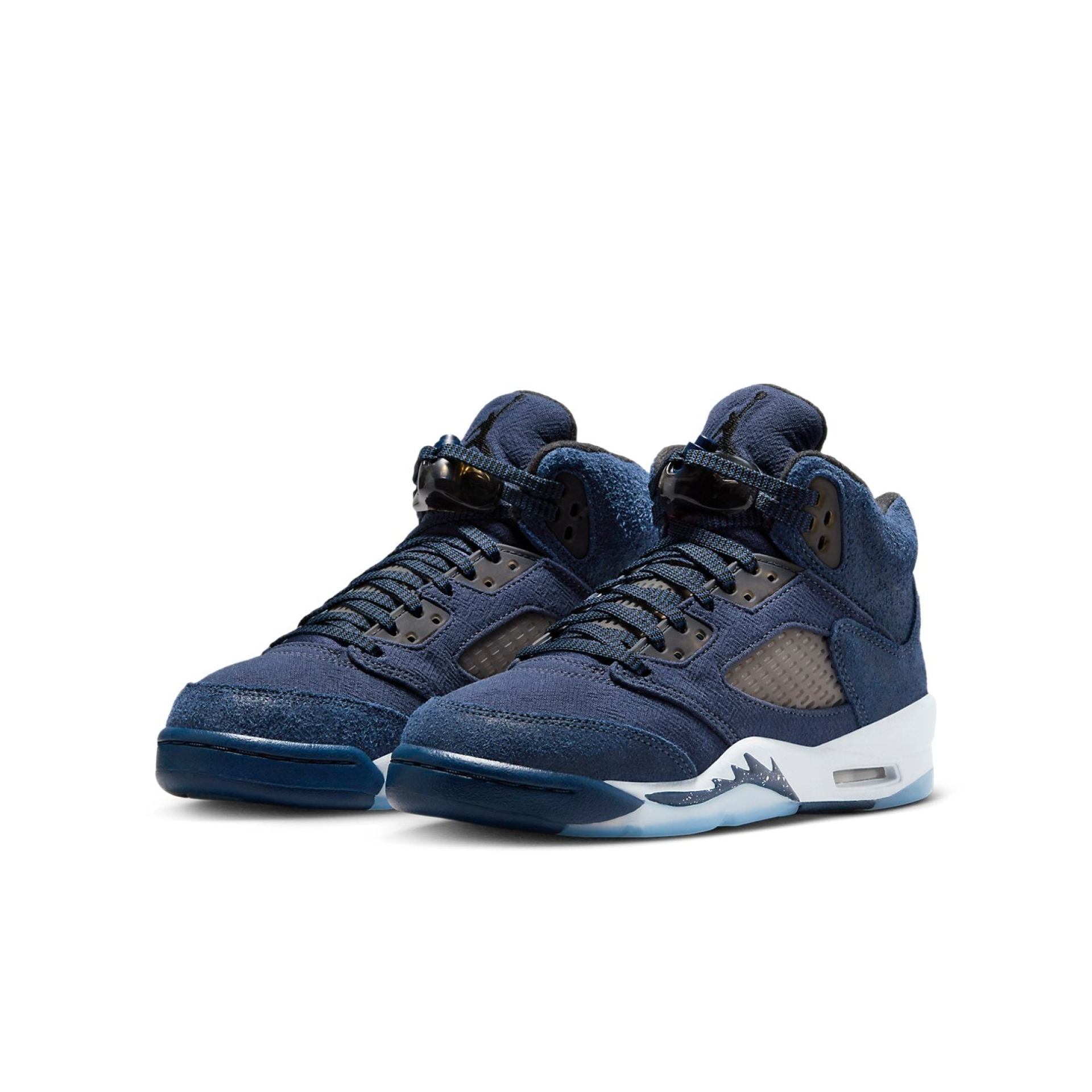 Built for big kids, the Air Jordan 5 Retro SE GS Midnight Navy utilizes textile paneling on the midfoot and toe box, while tonal suede construction appears throughout the padded collar and heel overlay. The latter is accented with an embroidered black Jumpman, matching a second Jumpman logo on the tongue. A contrasting white foam midsole features speckled shark tooth detailing and a visible Air-sole unit in the heel. Underfoot, a translucent rubber outsole yields durable traction.