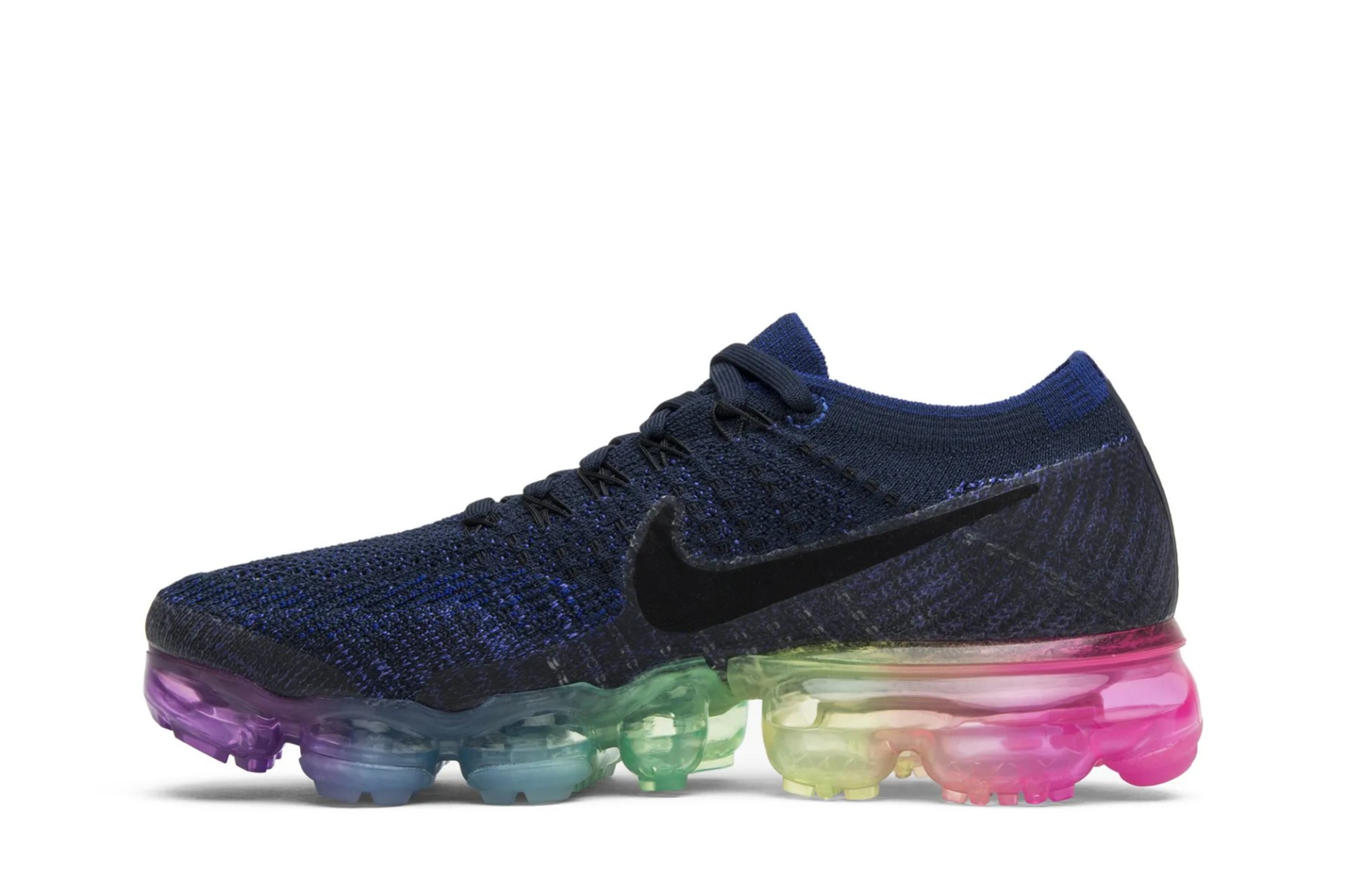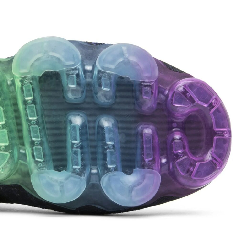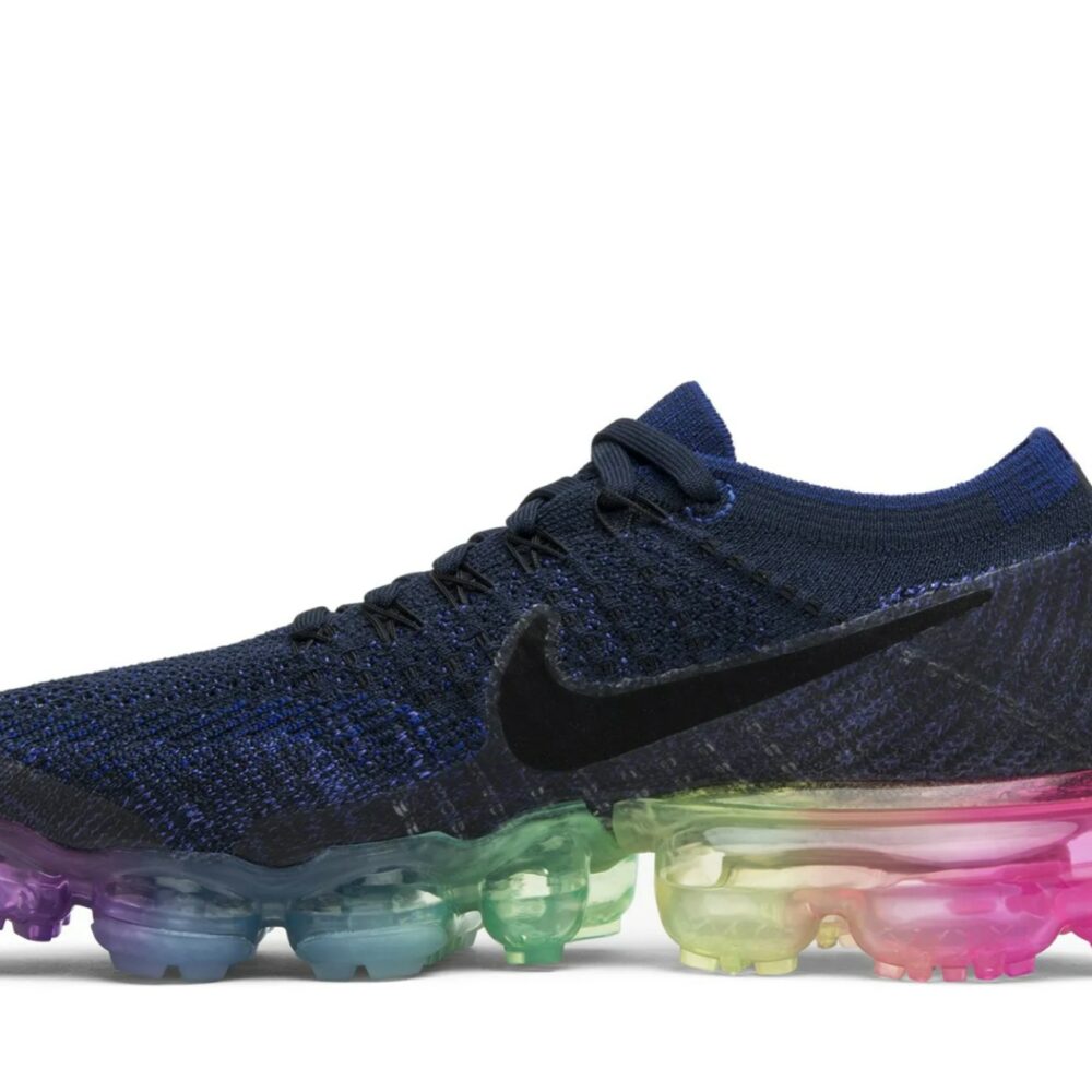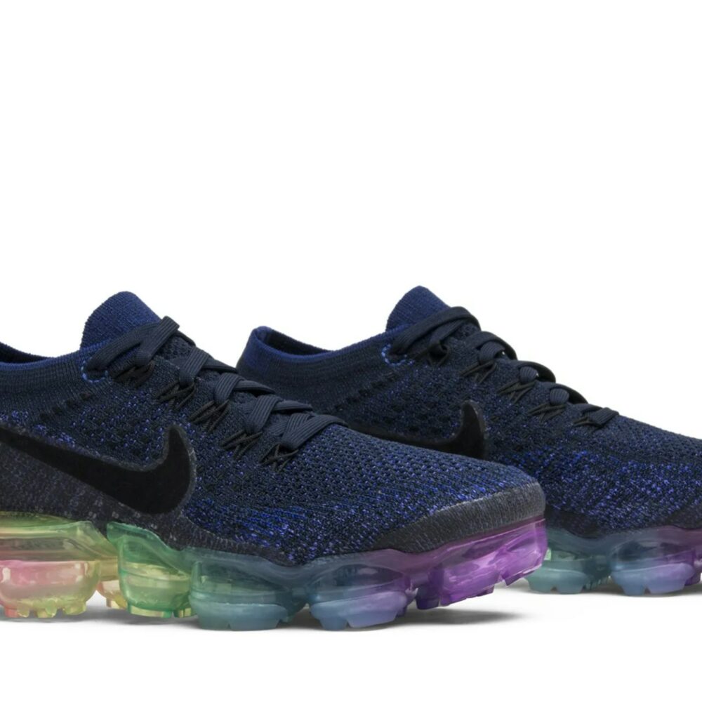 The NikeLab Wmns Air VaporMax ‘Be True’ celebrates the LGBTQ community with a rainbow Air VaporMax unit featuring the eight colors of the 1978 Pride flag. Released in June of 2017, the design also features a dark violet Flyknit upper with a black Nike swoosh and Flywire cables.