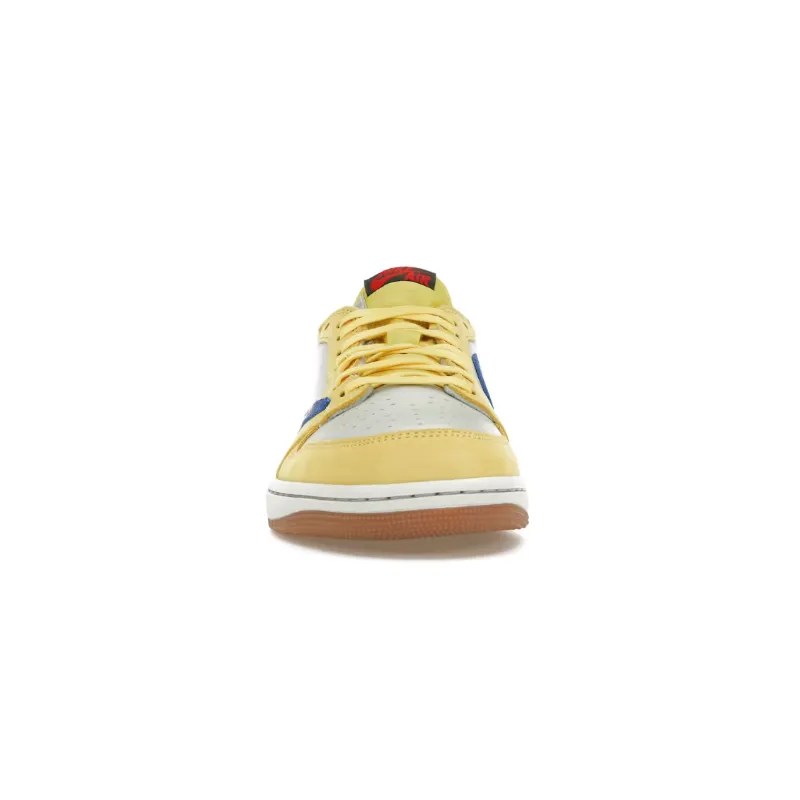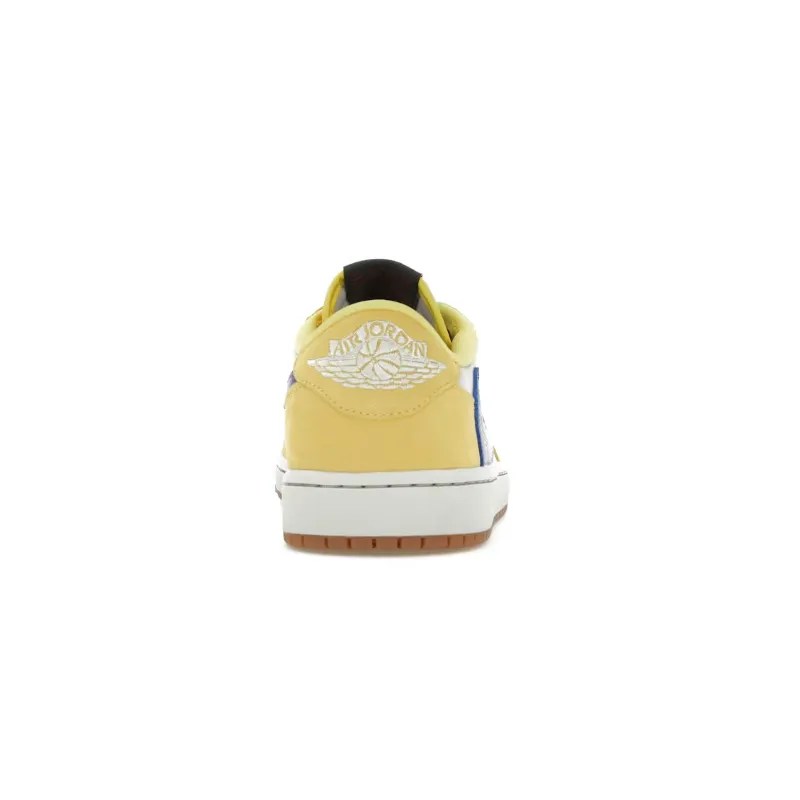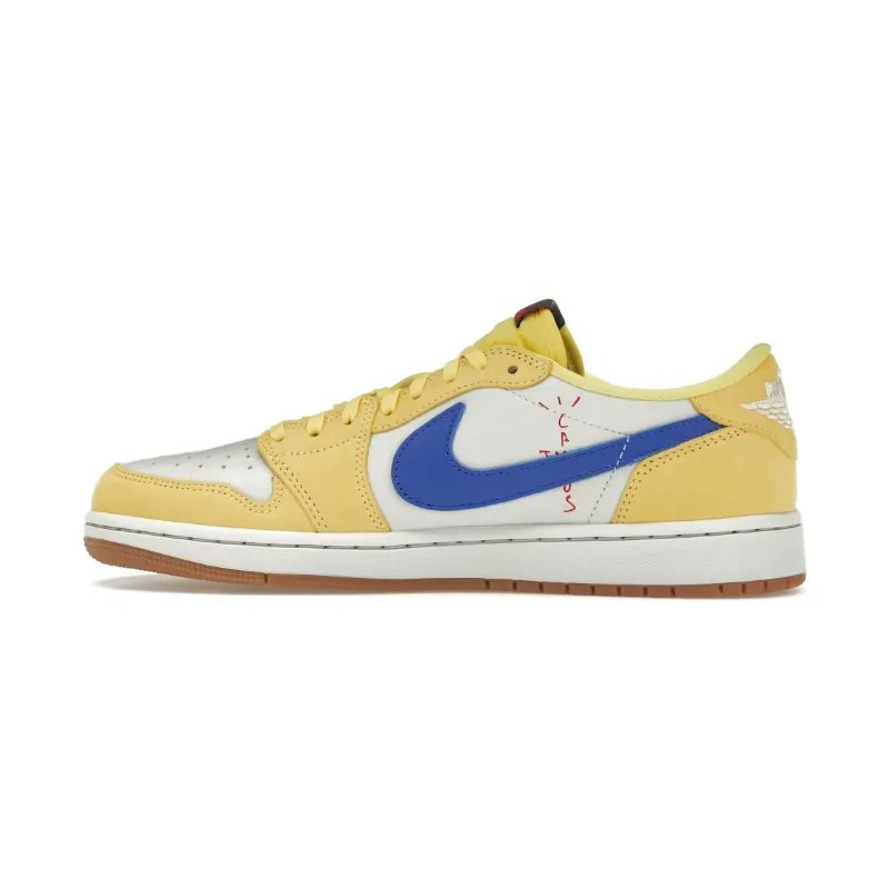 The Travis Scott x Women's Air Jordan 1 Retro Low OG SP 'Canary', also known as 'Elkins' after Travis Scott's High School, showcases the Houston rapper's signature reverse Swoosh, in Racer Blue adorning the lateral side of the shoe. A white leather upper is contrasted with yellow overlays at the forefoot and heel. A red and black Nike Air tag adorns the tongue, while mismatched Cactus Jack and Jordan Wings branding is embroidered in white on the heel tab of each shoe. The sneaker is underpinned by a traditional cupsole, highlighted by white textured sidewalls and a gum rubber outsole.