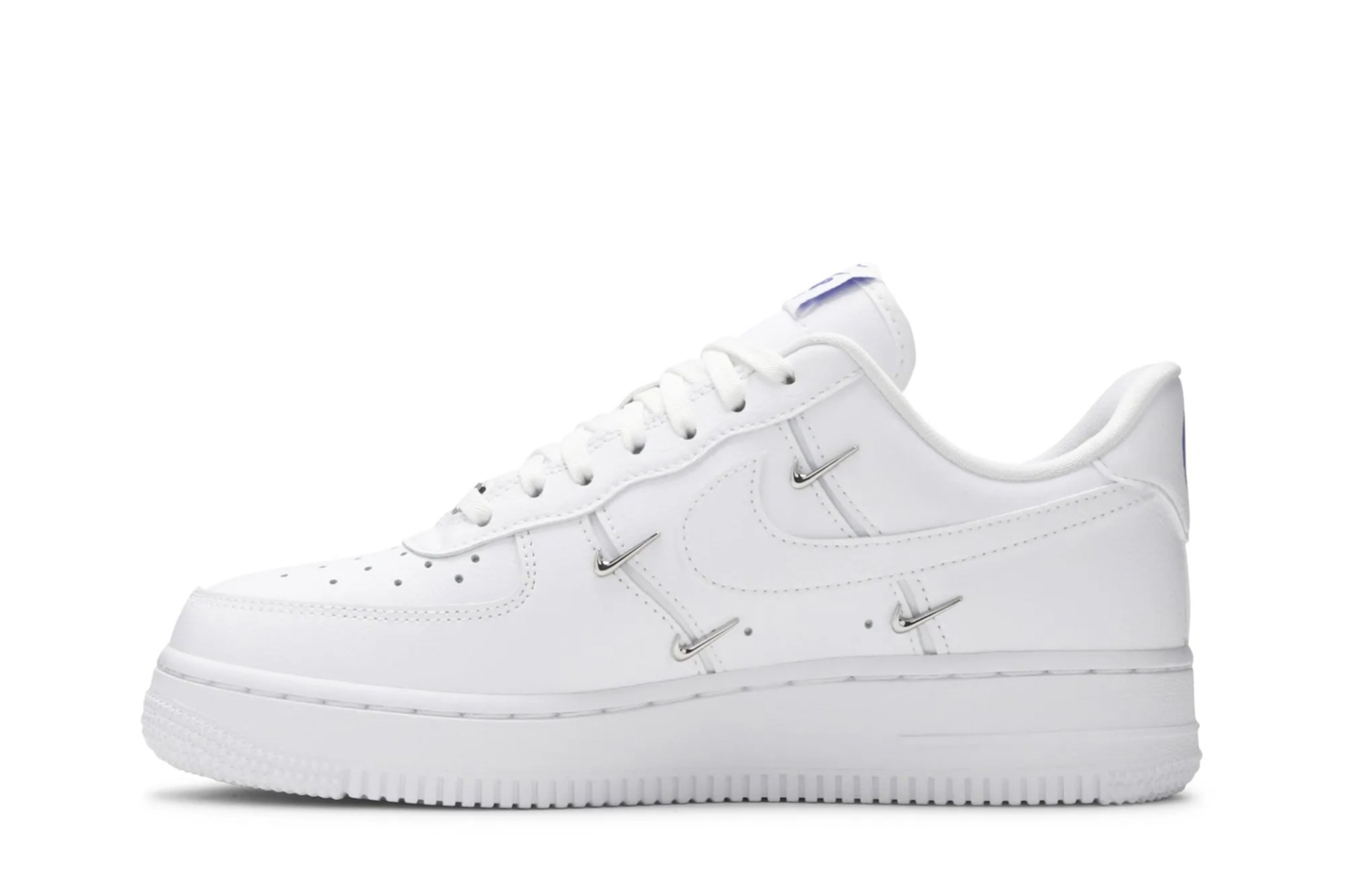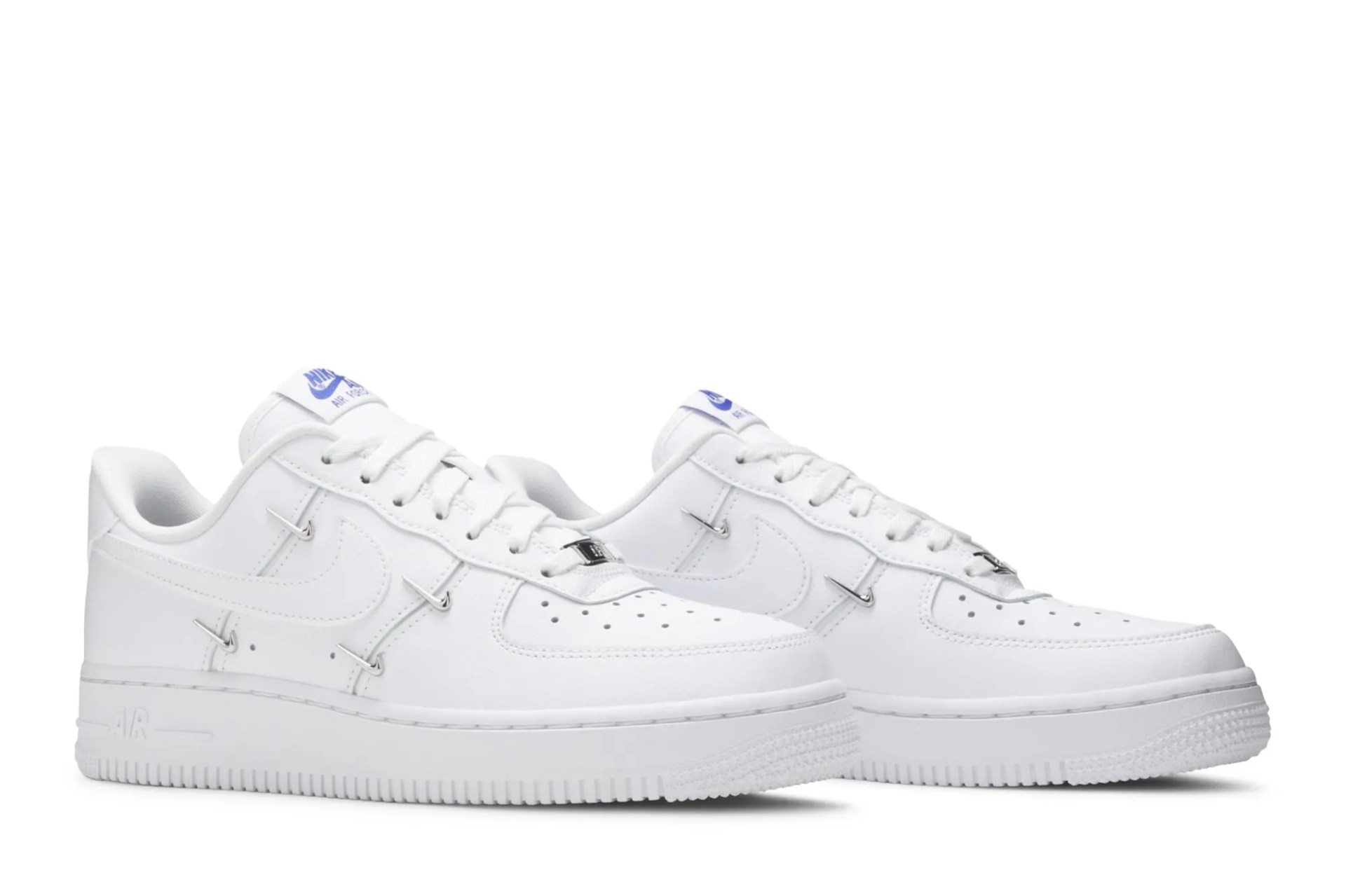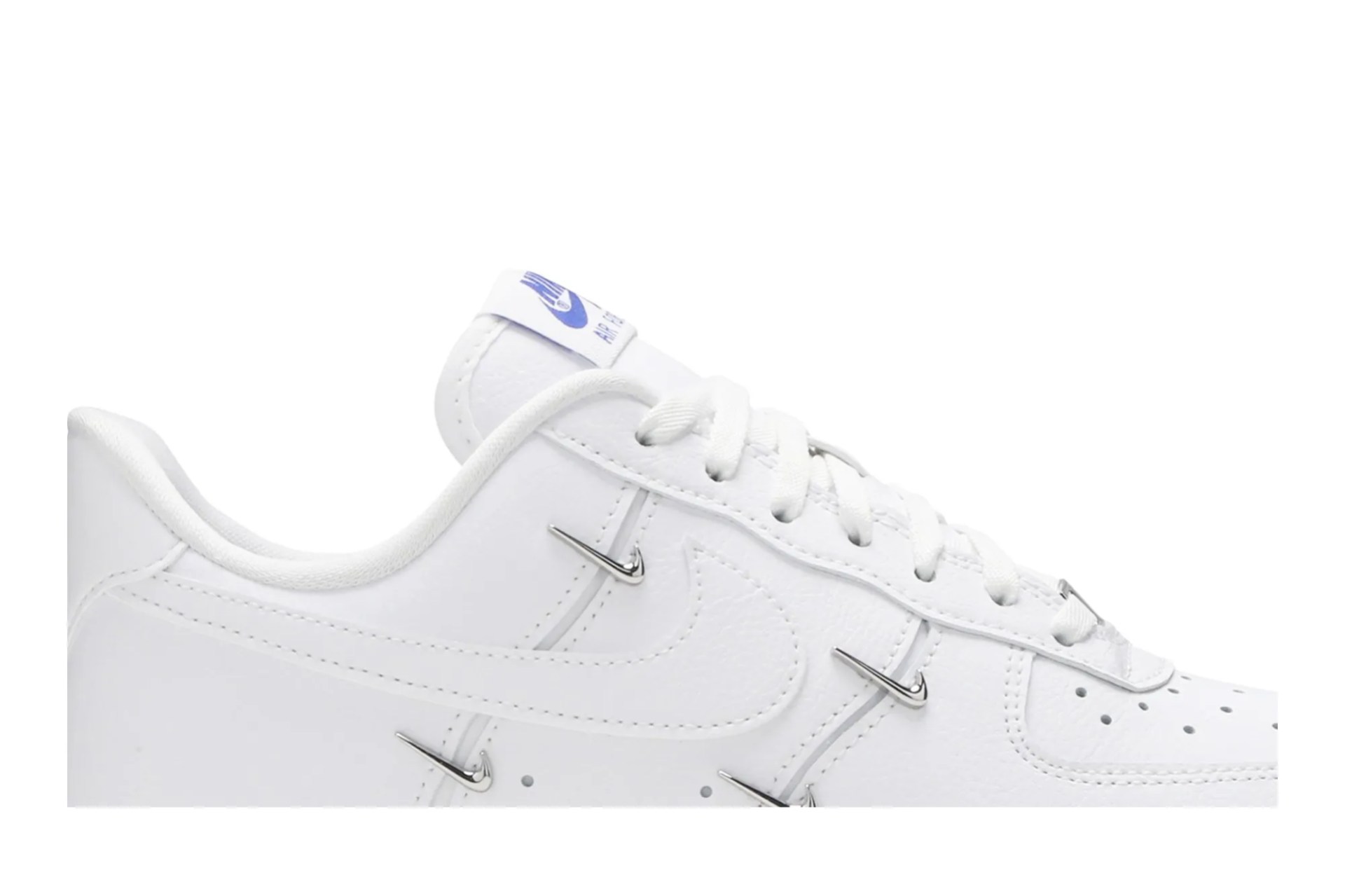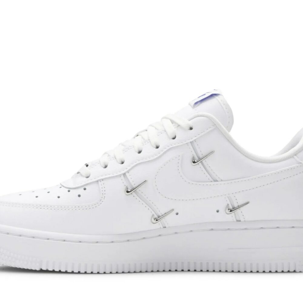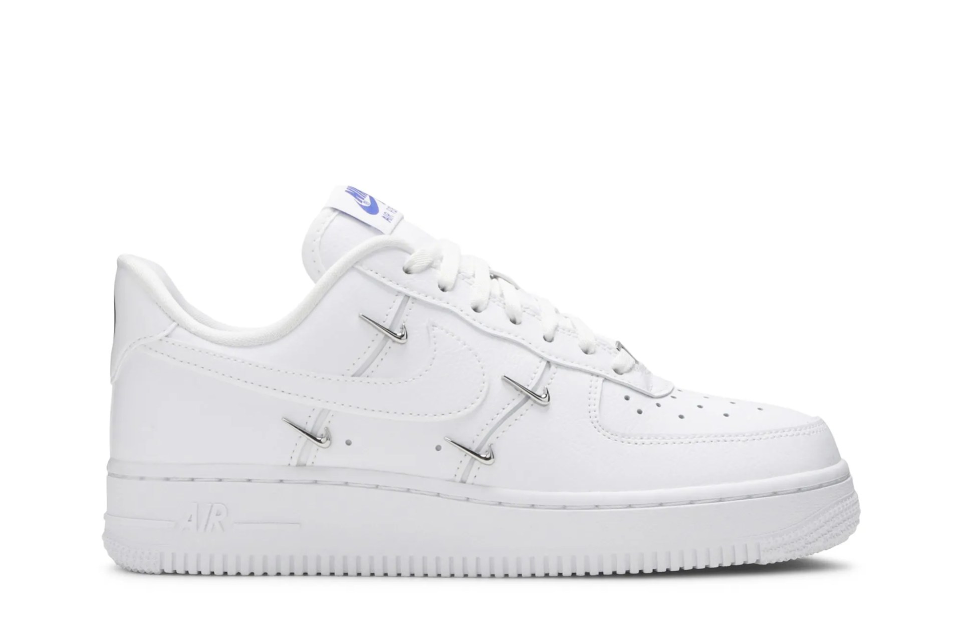 Launching as part of the brand’s ‘Sisterhood’ collection, the Nike women’s Air Force 1 ’07 LX ‘White Metallic Silver’ showcases a pristine white leather upper, accented with a quartet of 3D silver mini-Swooshes on each quarter panel. Hyper Royal hits add contrasting color to the Nike branding elements at the tongue and heel tab. Additional flashes of royal blue make their way to the sockliner, covered in an all-over print channeling a theme of female empowerment.