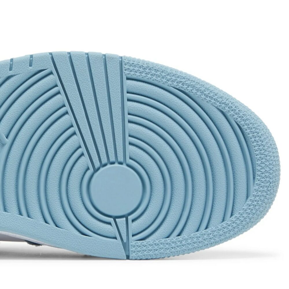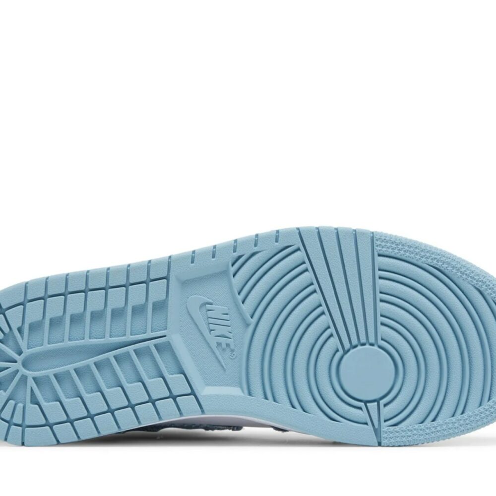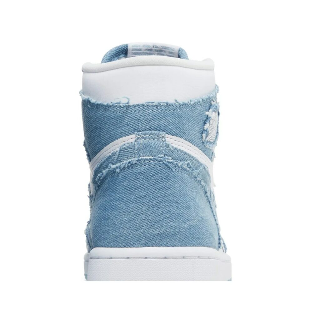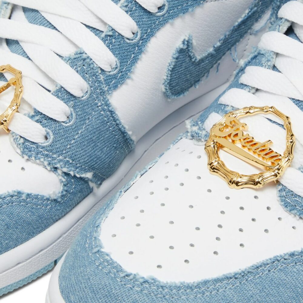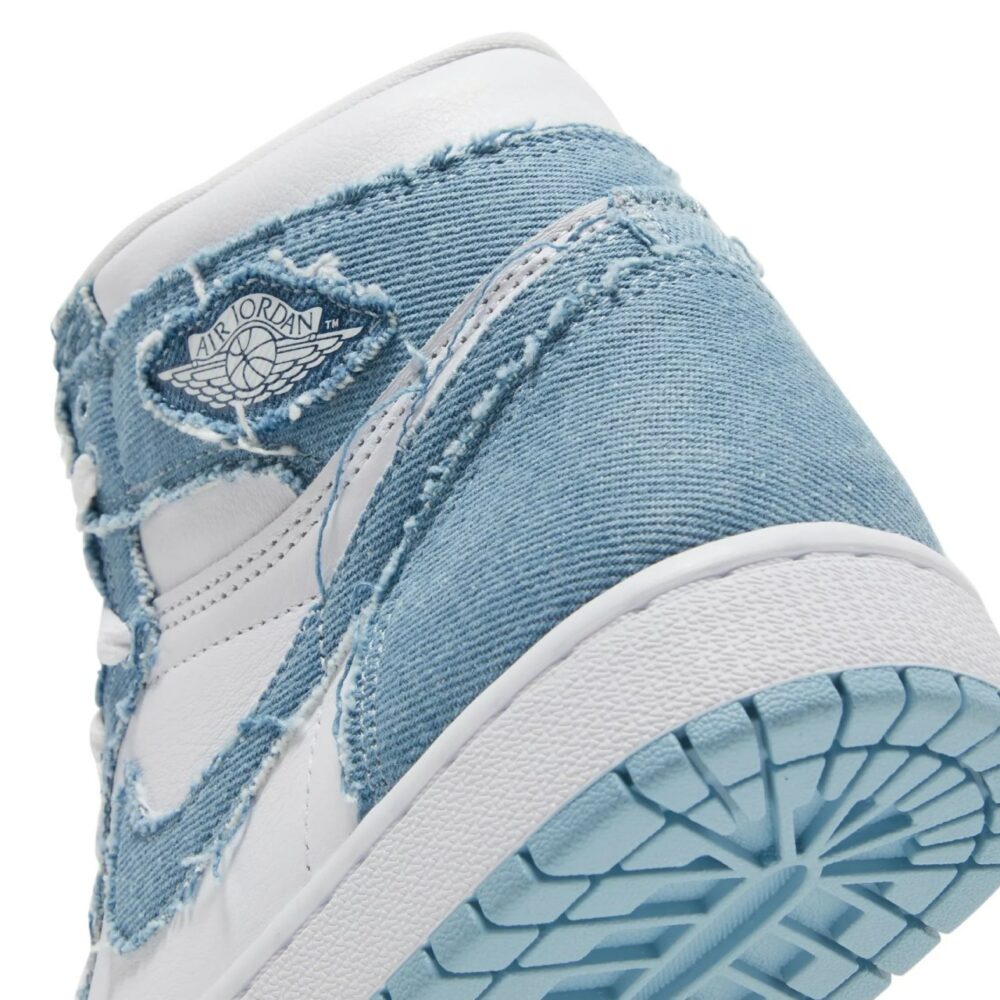 The women’s Air Jordan 1 Retro High OG ‘Denim’ updates the iconic silhouette with a material makeover inspired by the world of casual apparel. The high-top is clad in a white tumbled leather upper with denim overlays in washed indigo, complete with frayed edges for a worn-in aesthetic. The signature Wings logo appears on a sewed-on patch atop the lateral ankle, while oversized lace jewels in metallic gold feature a Jordan wordmark on one shoe and a molded Jumpman logo on the other. The sneaker rests on a rubber cupsole with encapsulated Air-sole cushioning in the heel.