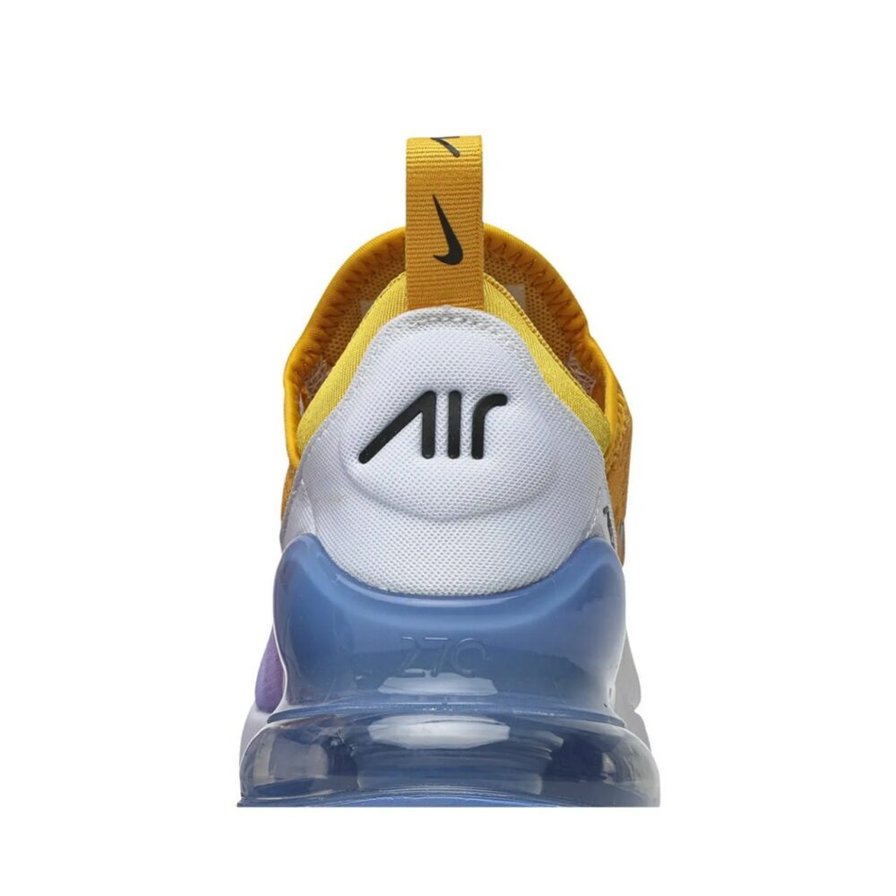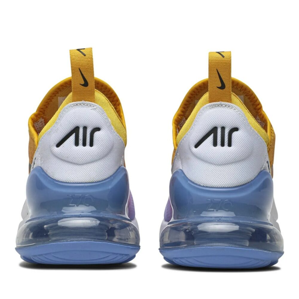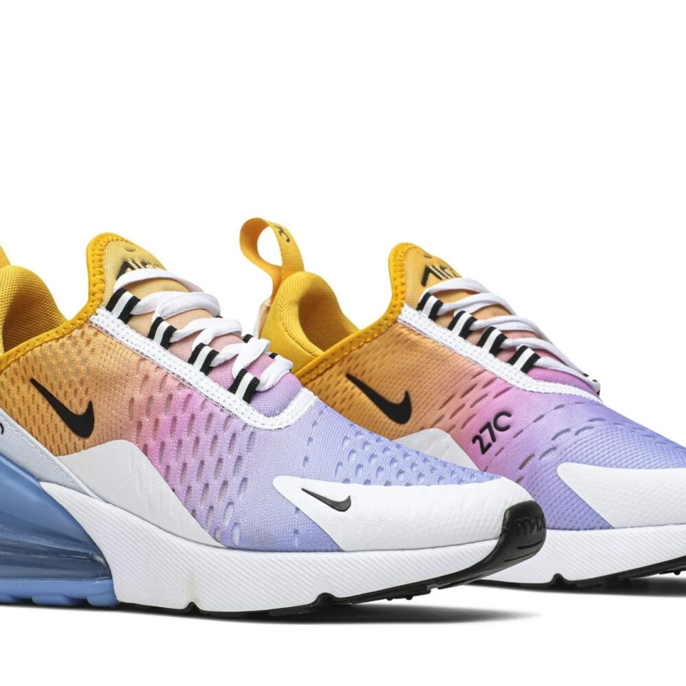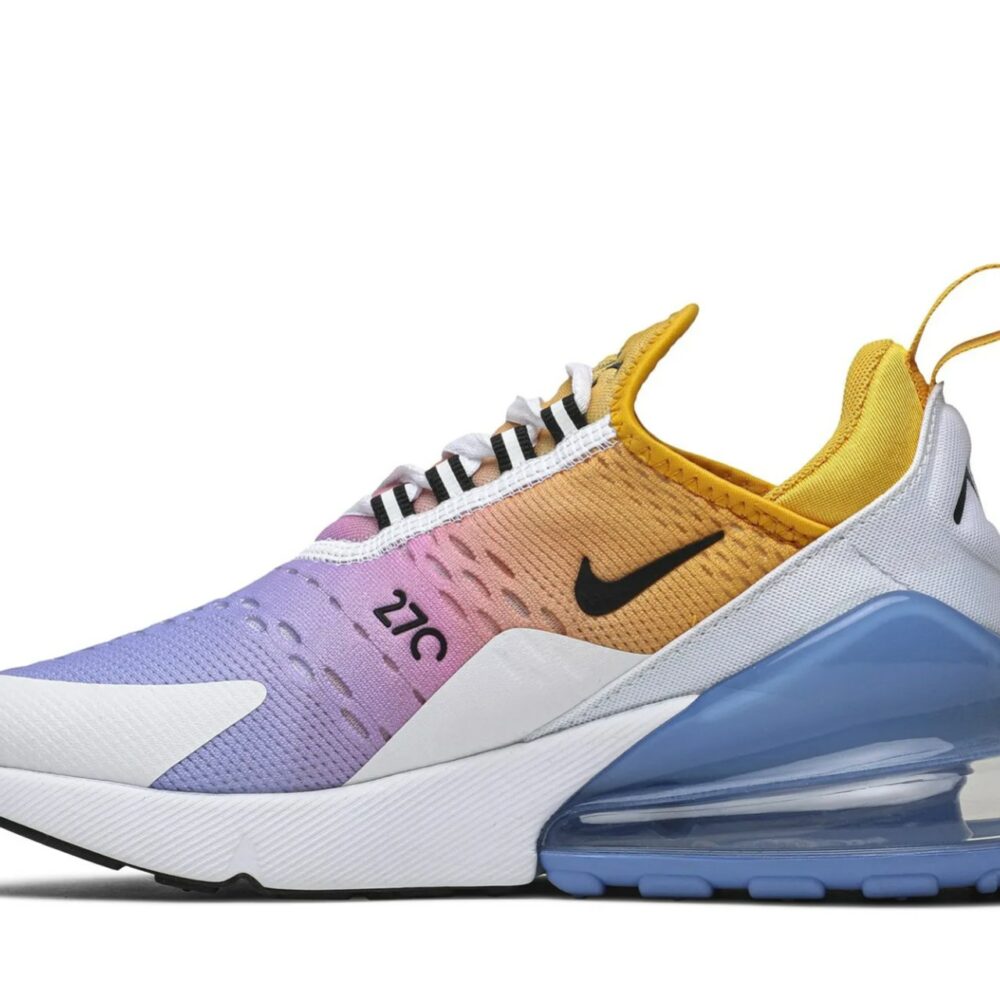 The Nike Air Max 270, Inspired by two Nike classics-the Air Max 180 and Air Max 93, is revised through this Wmns ‘University Gold’ edition. This women’s release from August 2019 is built with a breathable mesh upper cloaked in a summery gradient and white synthetic overlays for support. Representing the first Max Air cushioning unit created specifically for lifestyle wear, the shoe’s blue Max Air unit is complemented with white foam cushioning and a black rubber outsole.