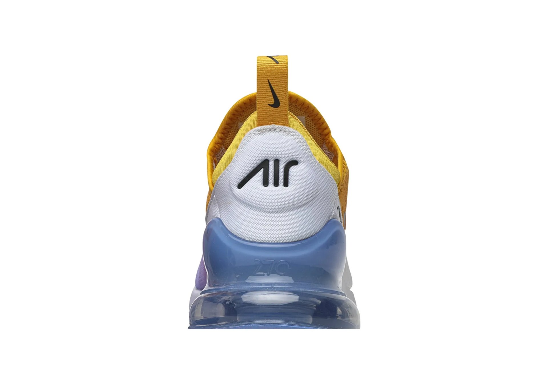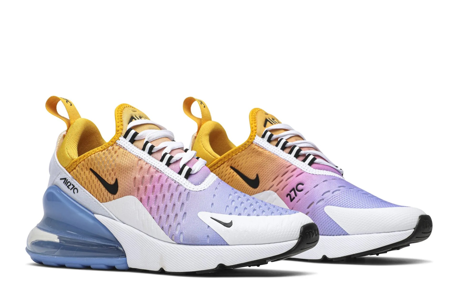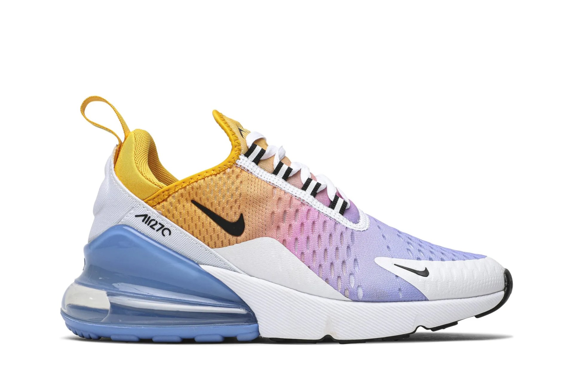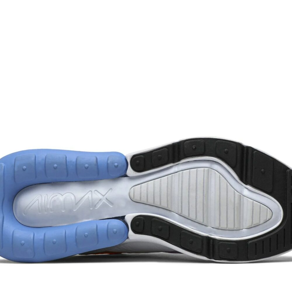 The Nike Air Max 270, Inspired by two Nike classics-the Air Max 180 and Air Max 93, is revised through this Wmns ‘University Gold’ edition. This women’s release from August 2019 is built with a breathable mesh upper cloaked in a summery gradient and white synthetic overlays for support. Representing the first Max Air cushioning unit created specifically for lifestyle wear, the shoe’s blue Max Air unit is complemented with white foam cushioning and a black rubber outsole.